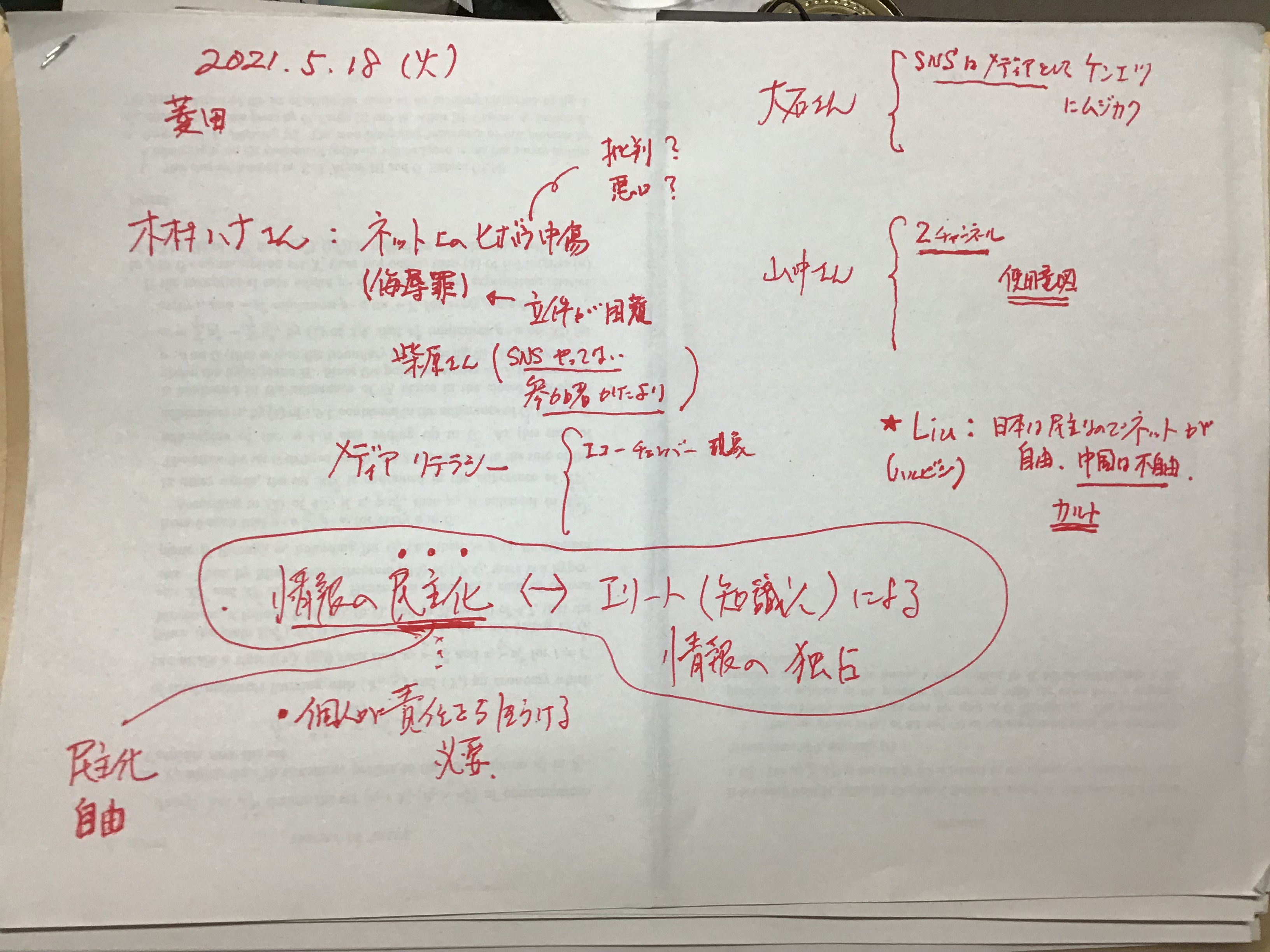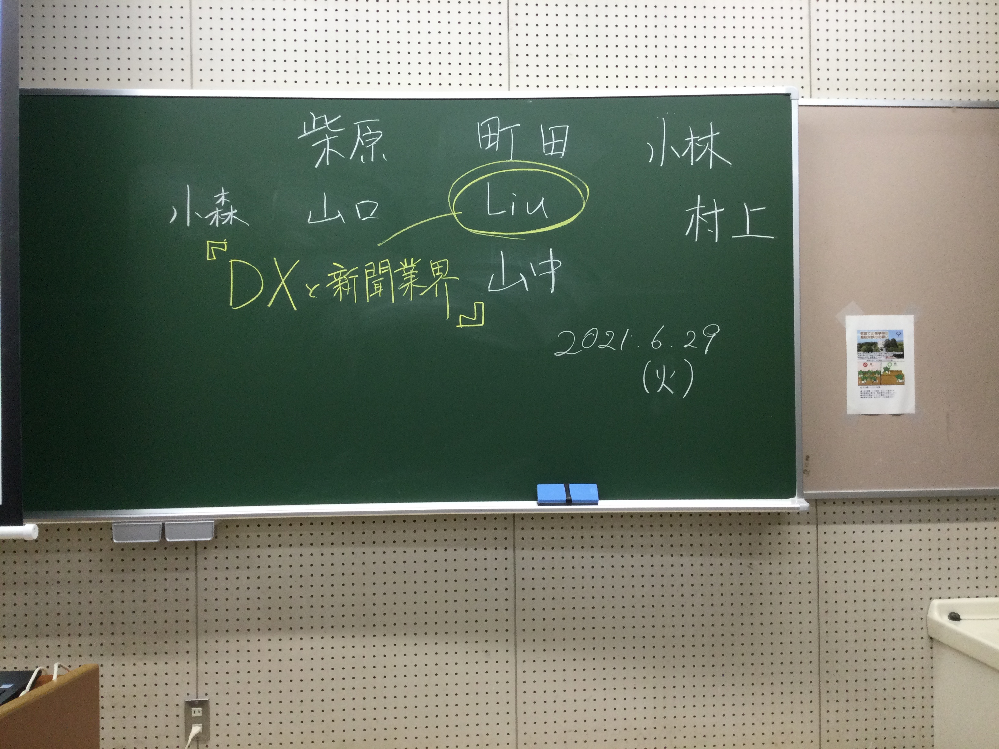 本日もお疲れ様でした。Liu さんの新聞業界の今後というテーマで時間を延長して7時近くまで皆で議論できました。Liu さんのテーマをもう一歩、全体テーマである「人と人との距離・コミュニケーションとプライバシー」にまで進められたら、ものすごく面白い話になるという予感であふれているのですが、今日はそこまでは進められず、残念というか、私の進行不十分をお詫びします。村上先生が撮ってくださった写真をアップします。次週は柴原さんにお願いしました。「教育」ですので、次回は間違いなく全体テーマを意識して進められると思います。
