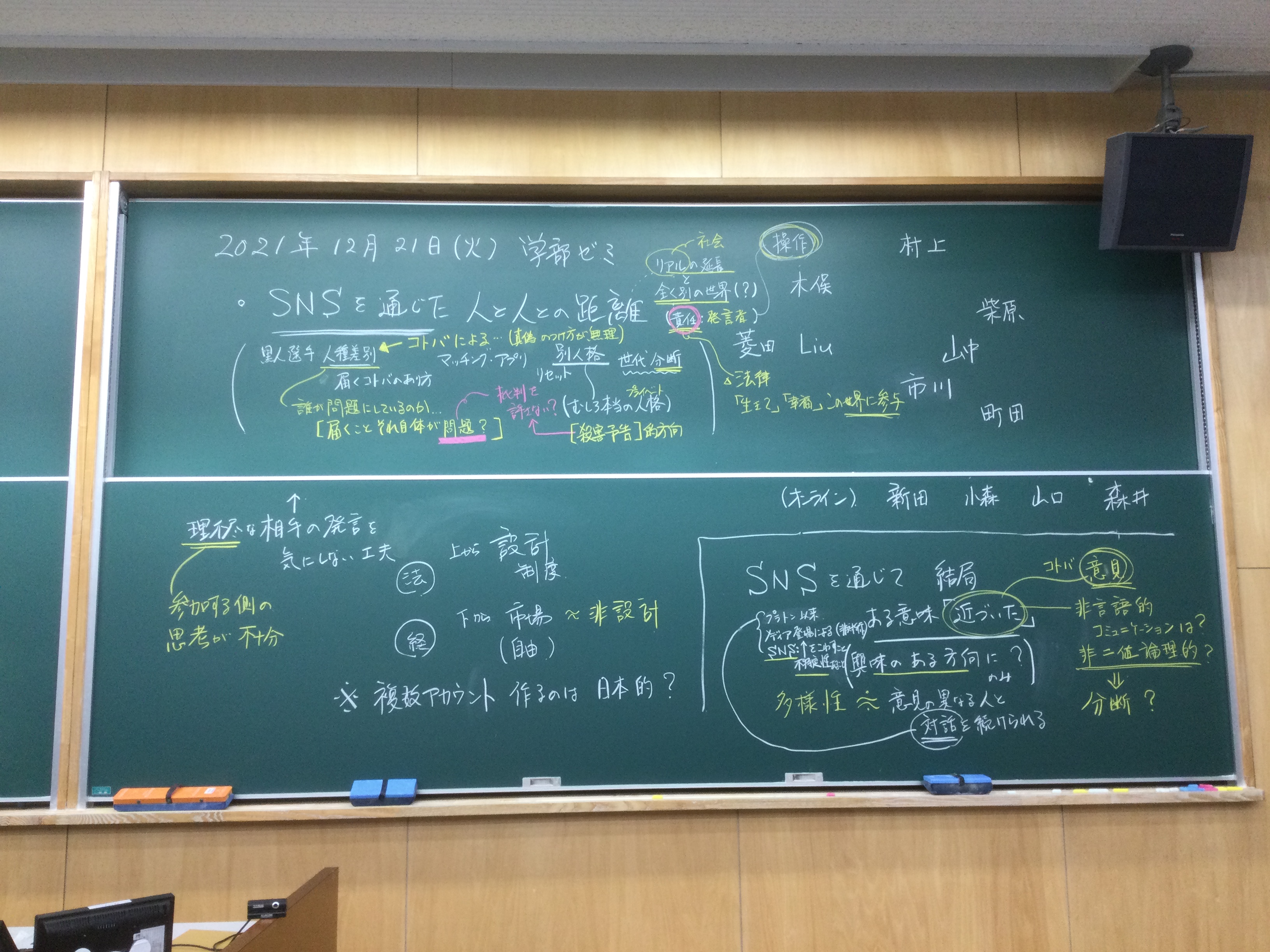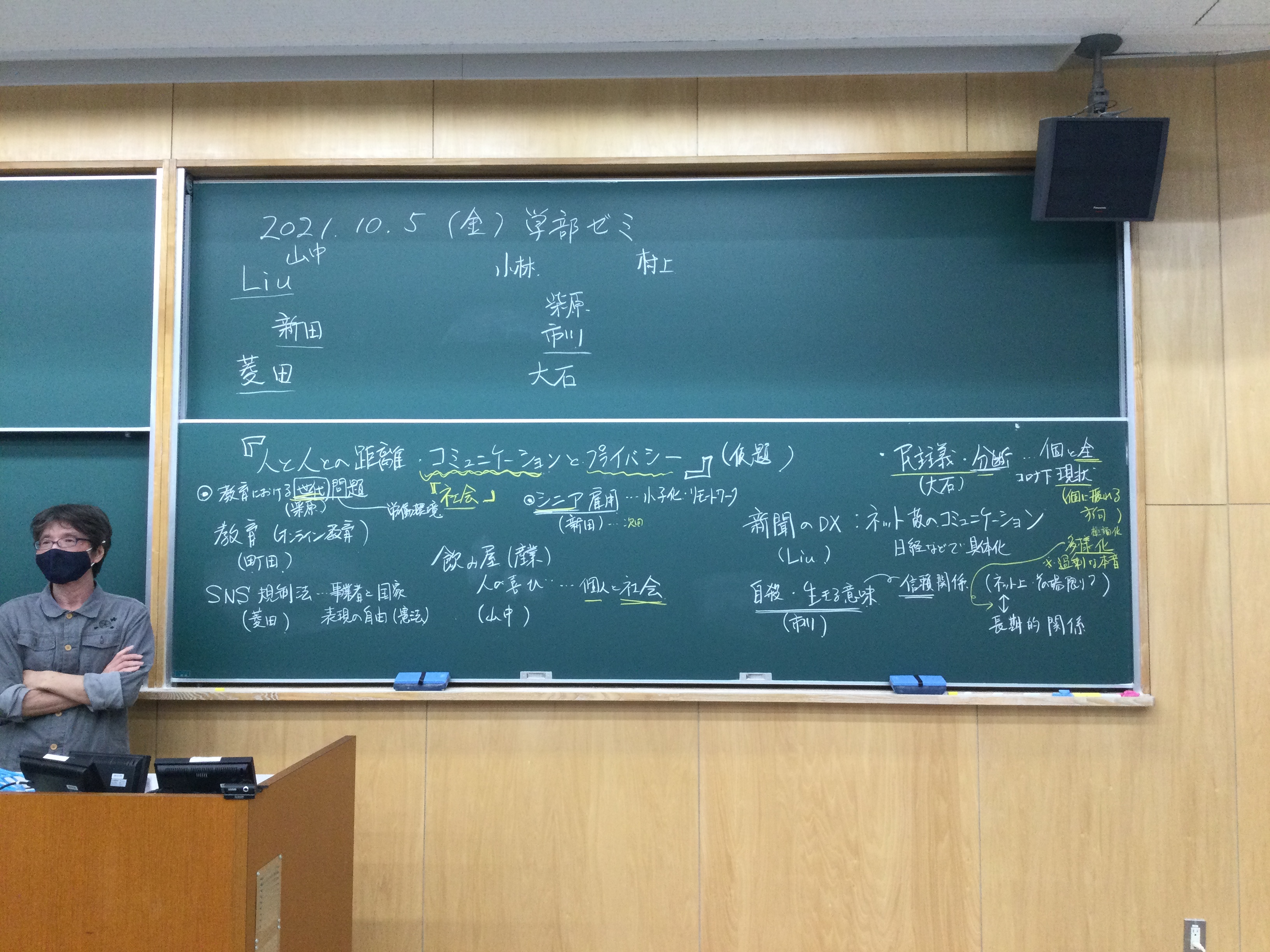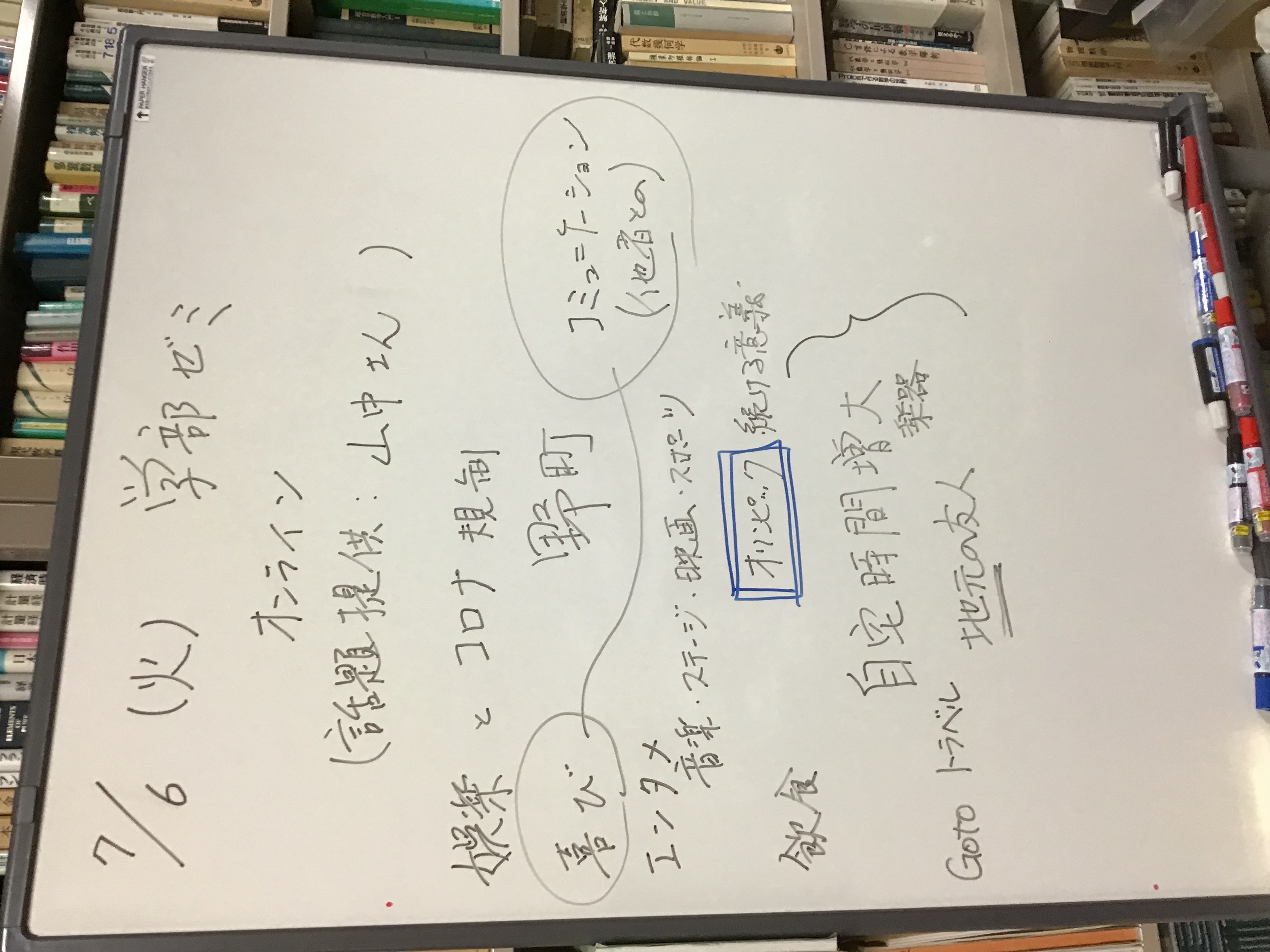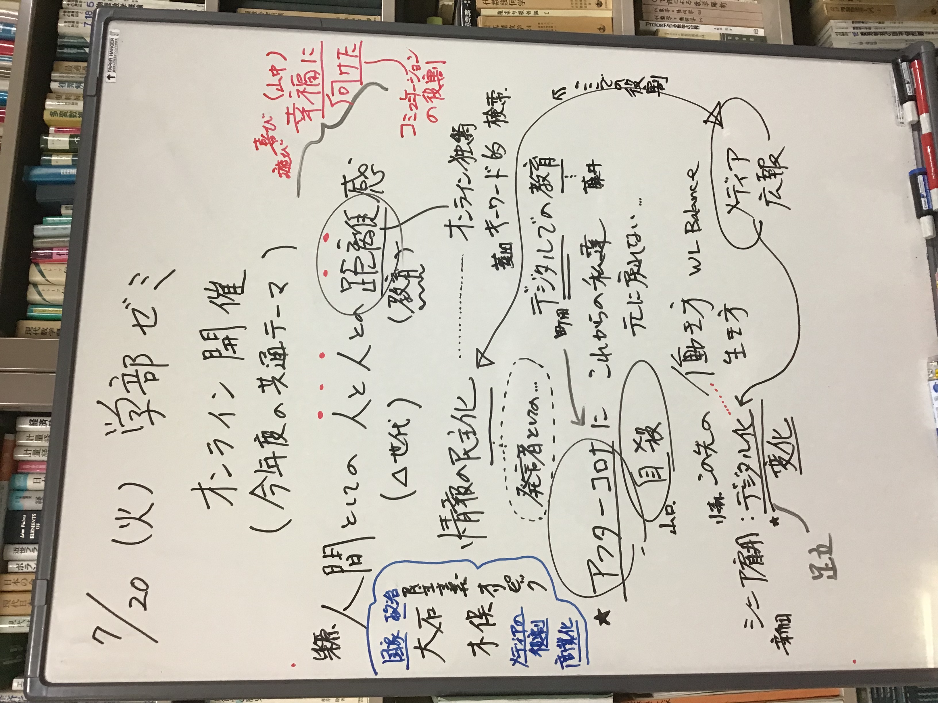 全体テーマについて話し合いました。板書をアップします。アフター(ポスト・ウィズ)コロナ時代、デジタル技術下のメディアの役割、商業化、オンラインでのコミュニケーションの役割等を踏まえた、人と人との距離感ということを(もう少し短めにまとめながら)、全体テーマを考えていきたいと思います。