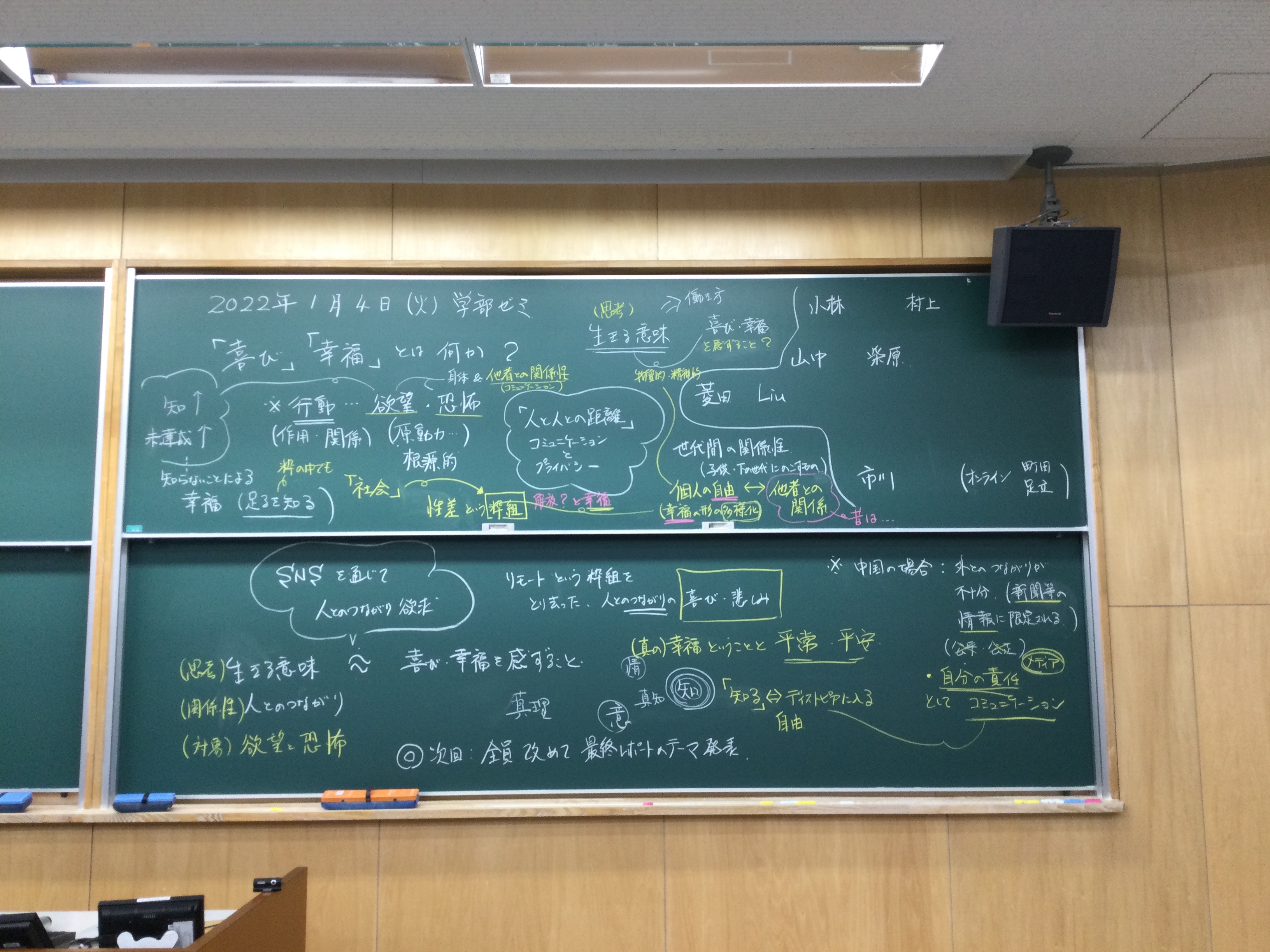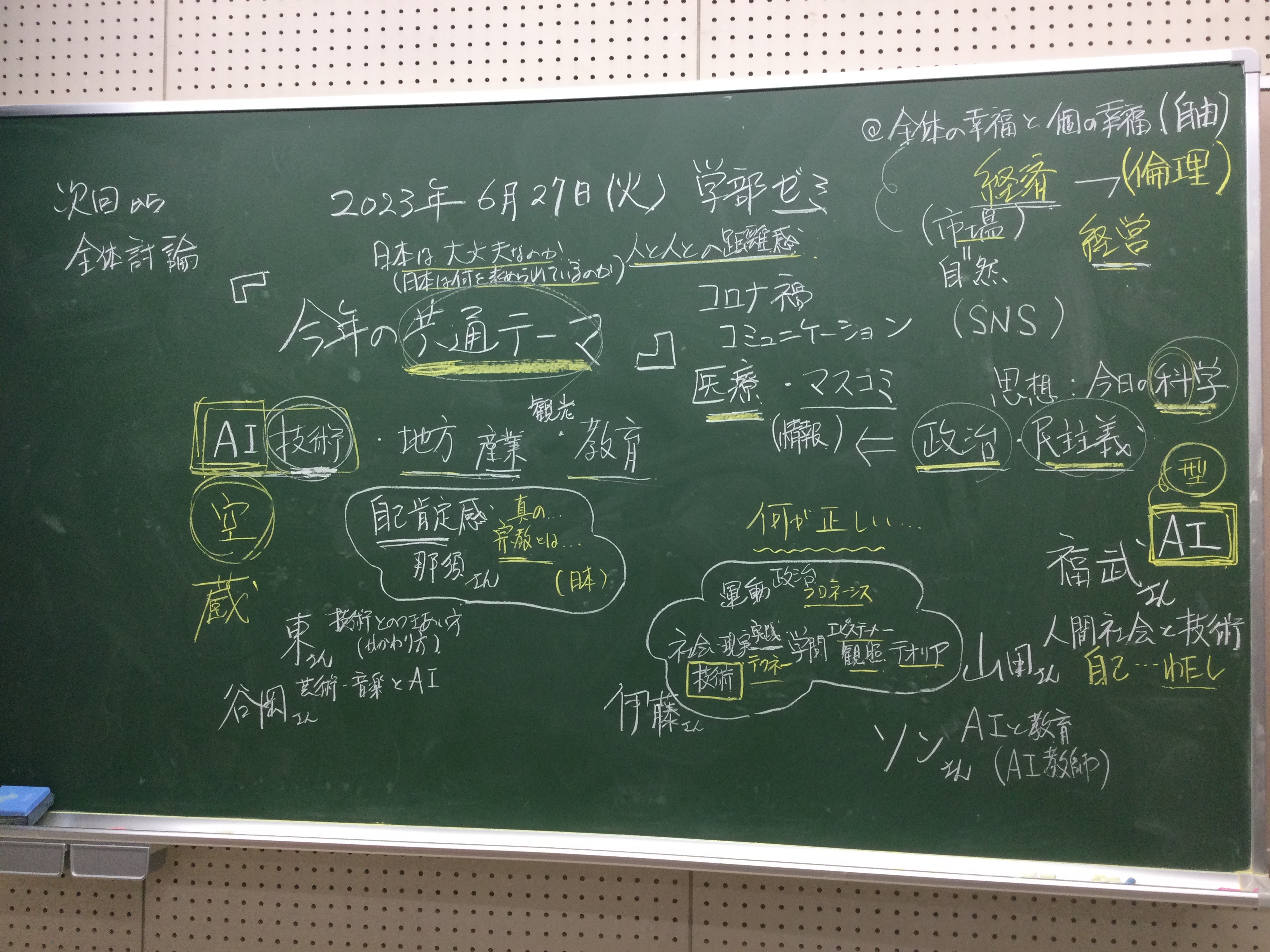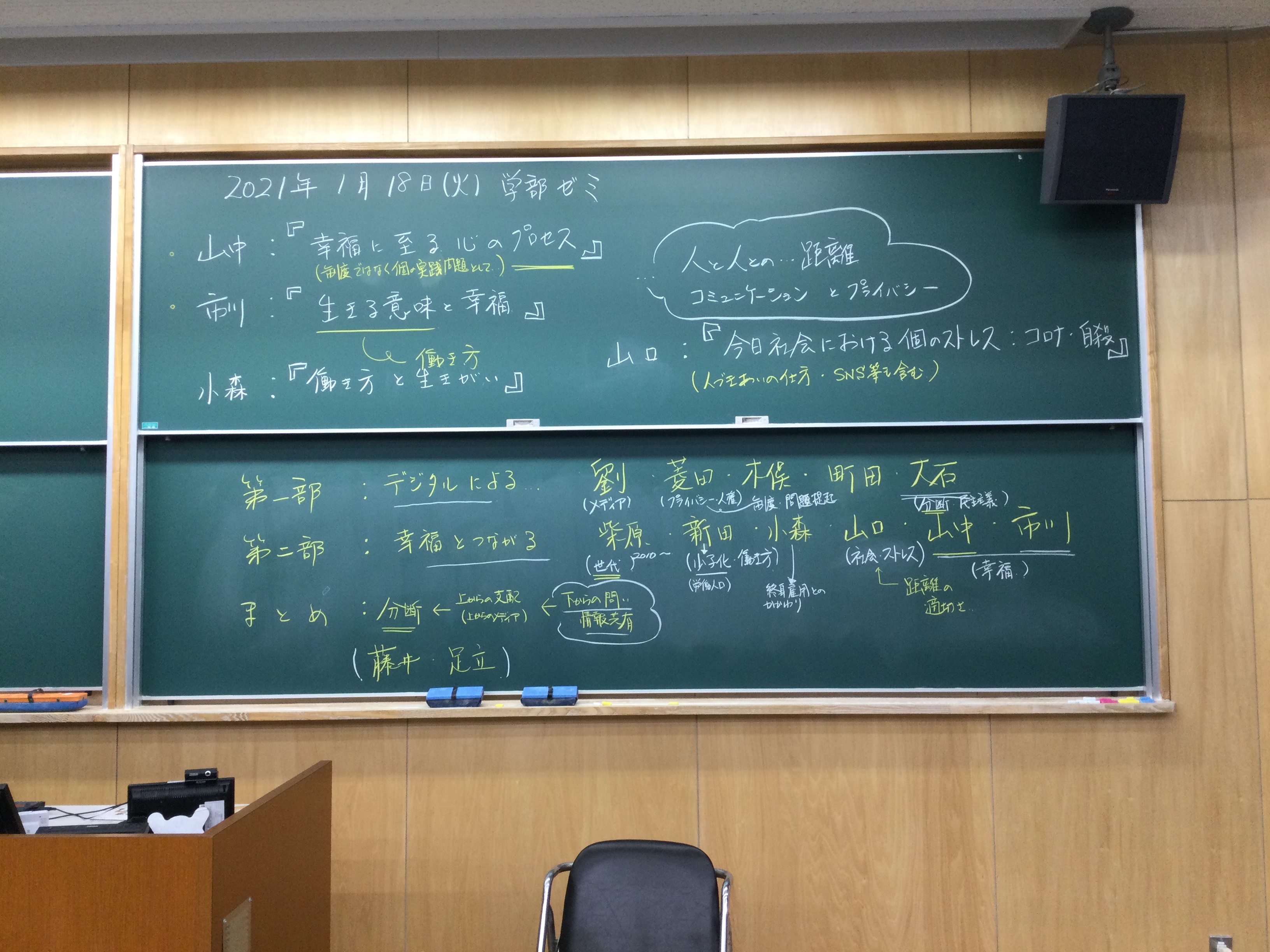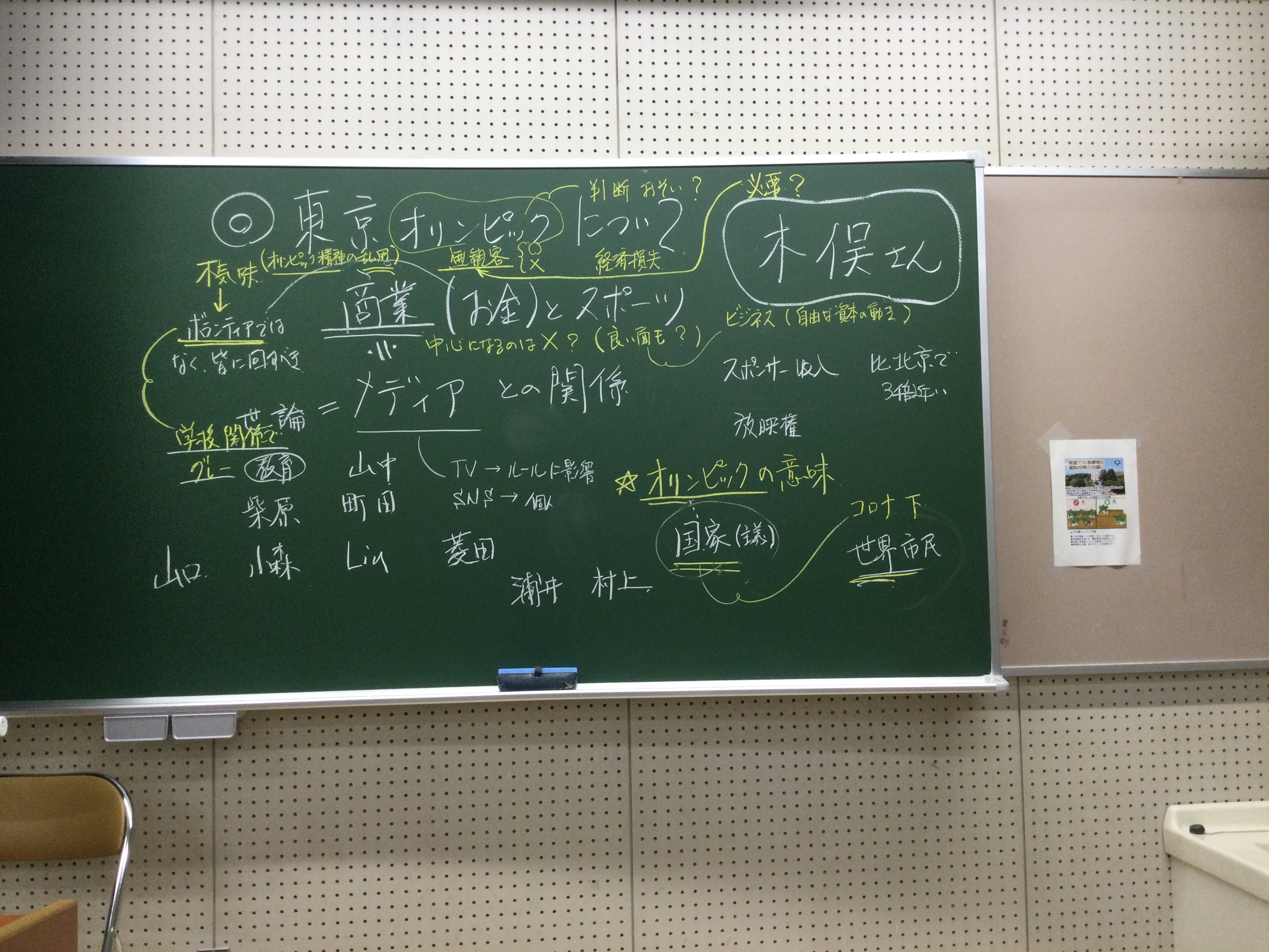 全体テーマについて話し合いました。板書をアップします。アフター(ポスト・ウィズ)コロナ時代、デジタル技術下のメディアの役割、商業化、オンラインでのコミュニケーションの役割等を踏まえた、人と人との距離感ということを(もう少し短めにまとめながら)、全体テーマを考えていきたいと思います。