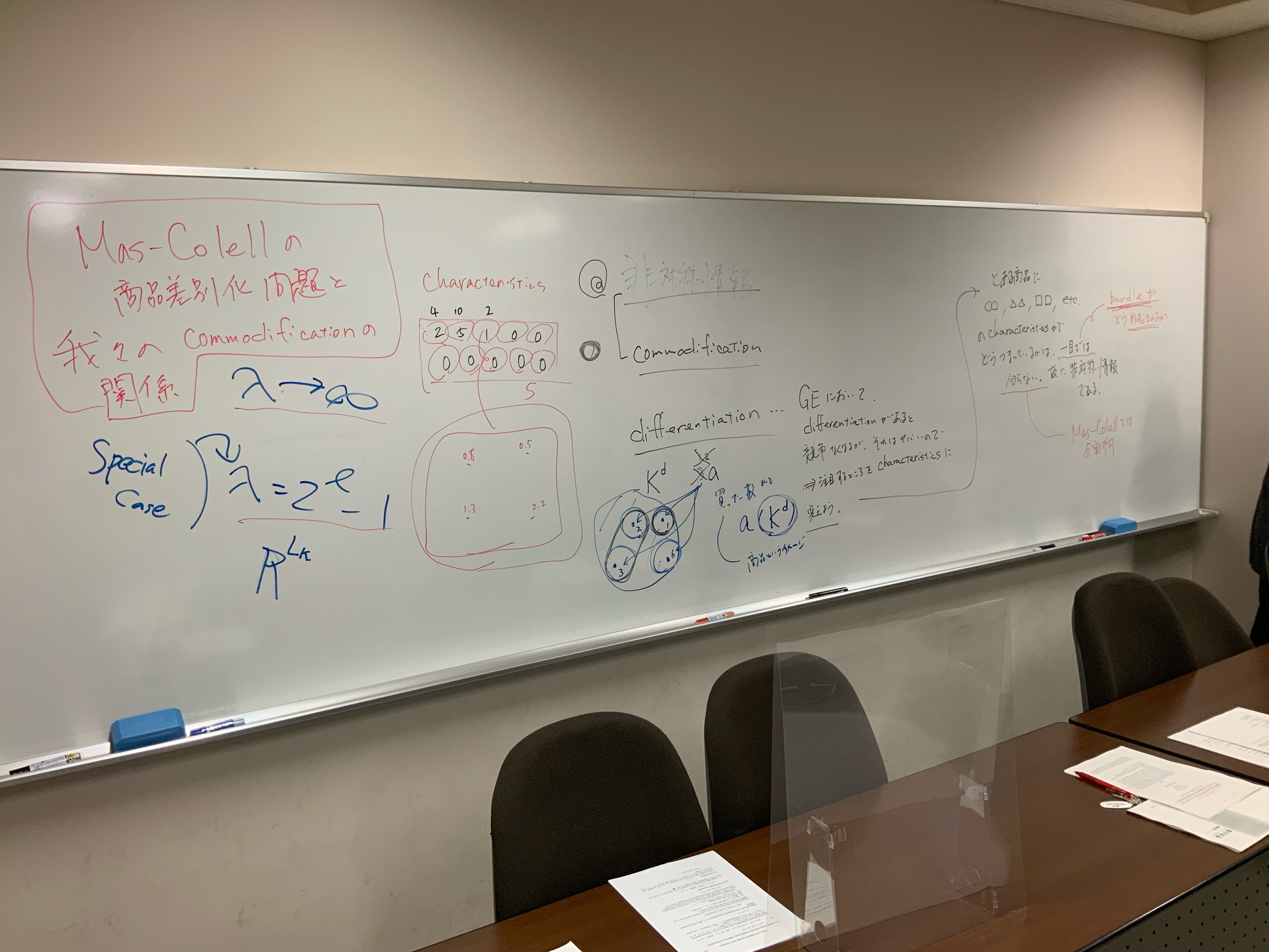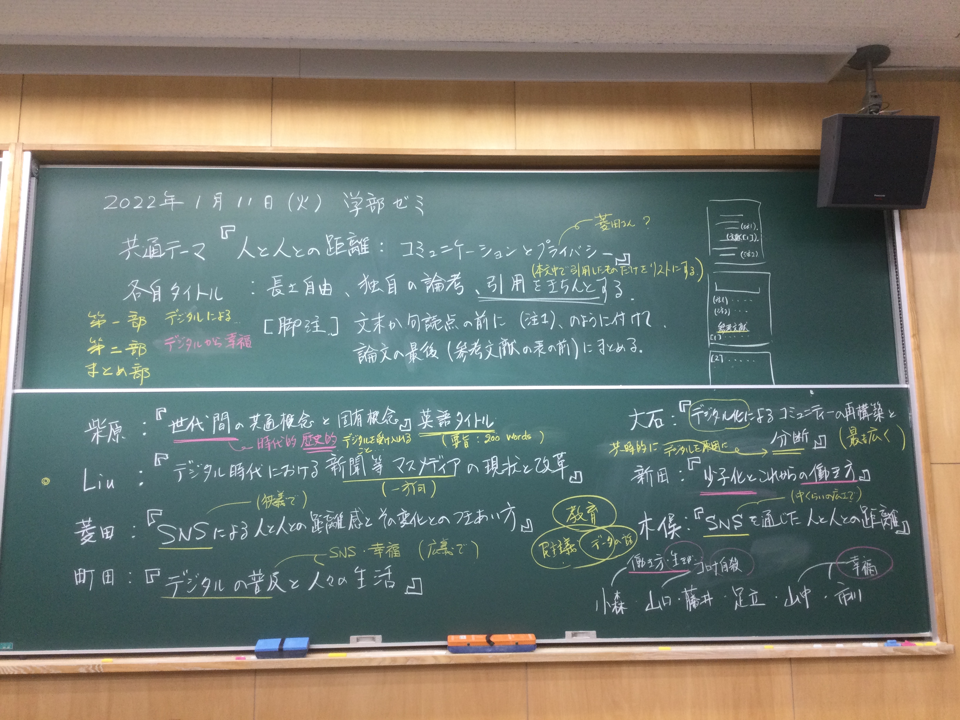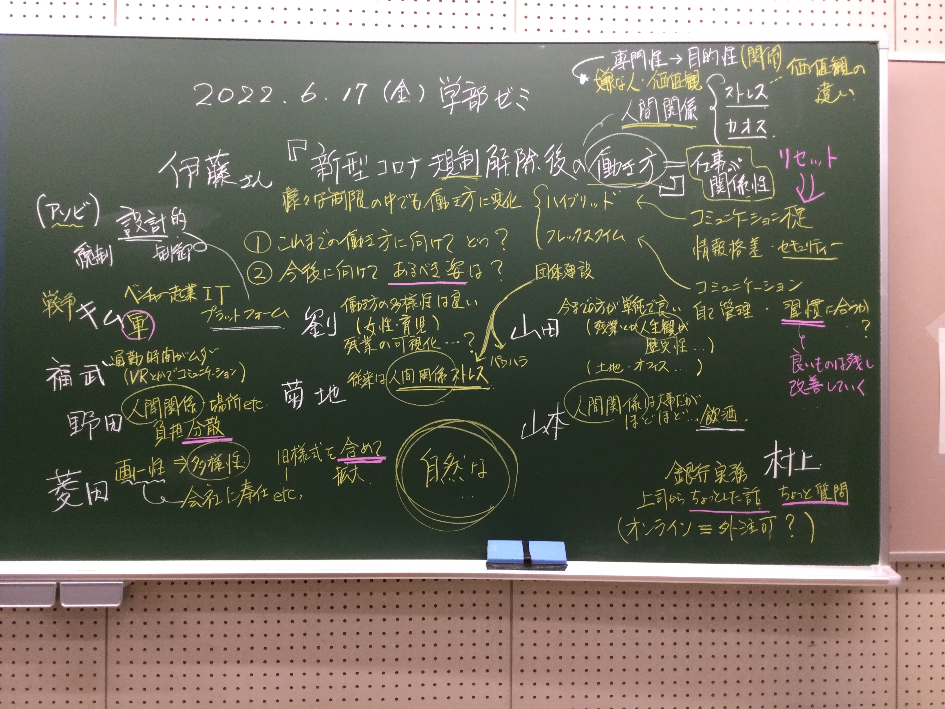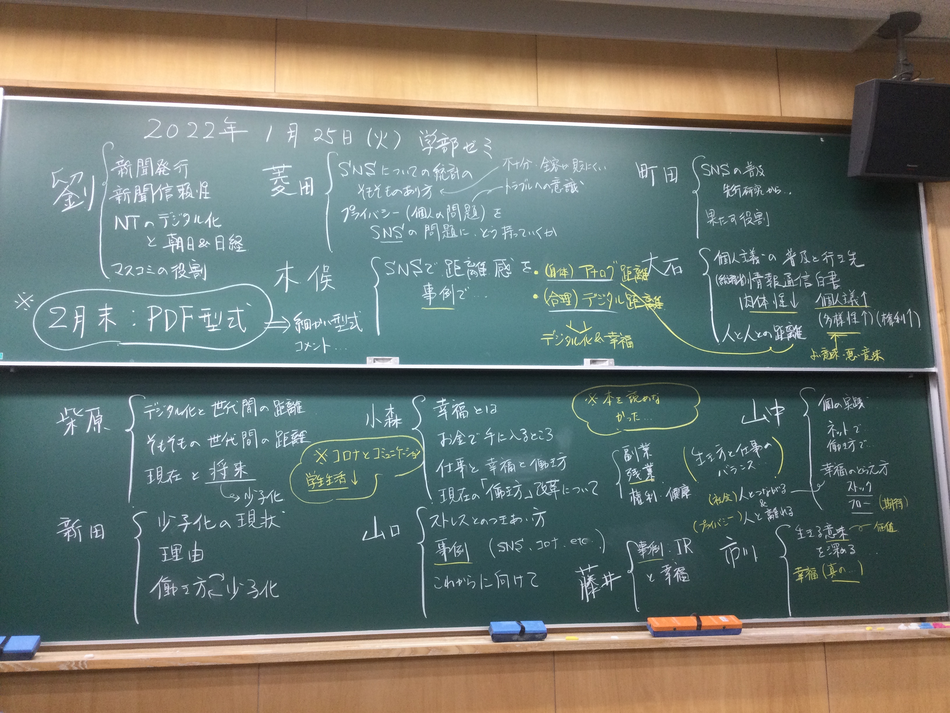 全体テーマについて話し合いました。板書をアップします。アフター(ポスト・ウィズ)コロナ時代、デジタル技術下のメディアの役割、商業化、オンラインでのコミュニケーションの役割等を踏まえた、人と人との距離感ということを(もう少し短めにまとめながら)、全体テーマを考えていきたいと思います。