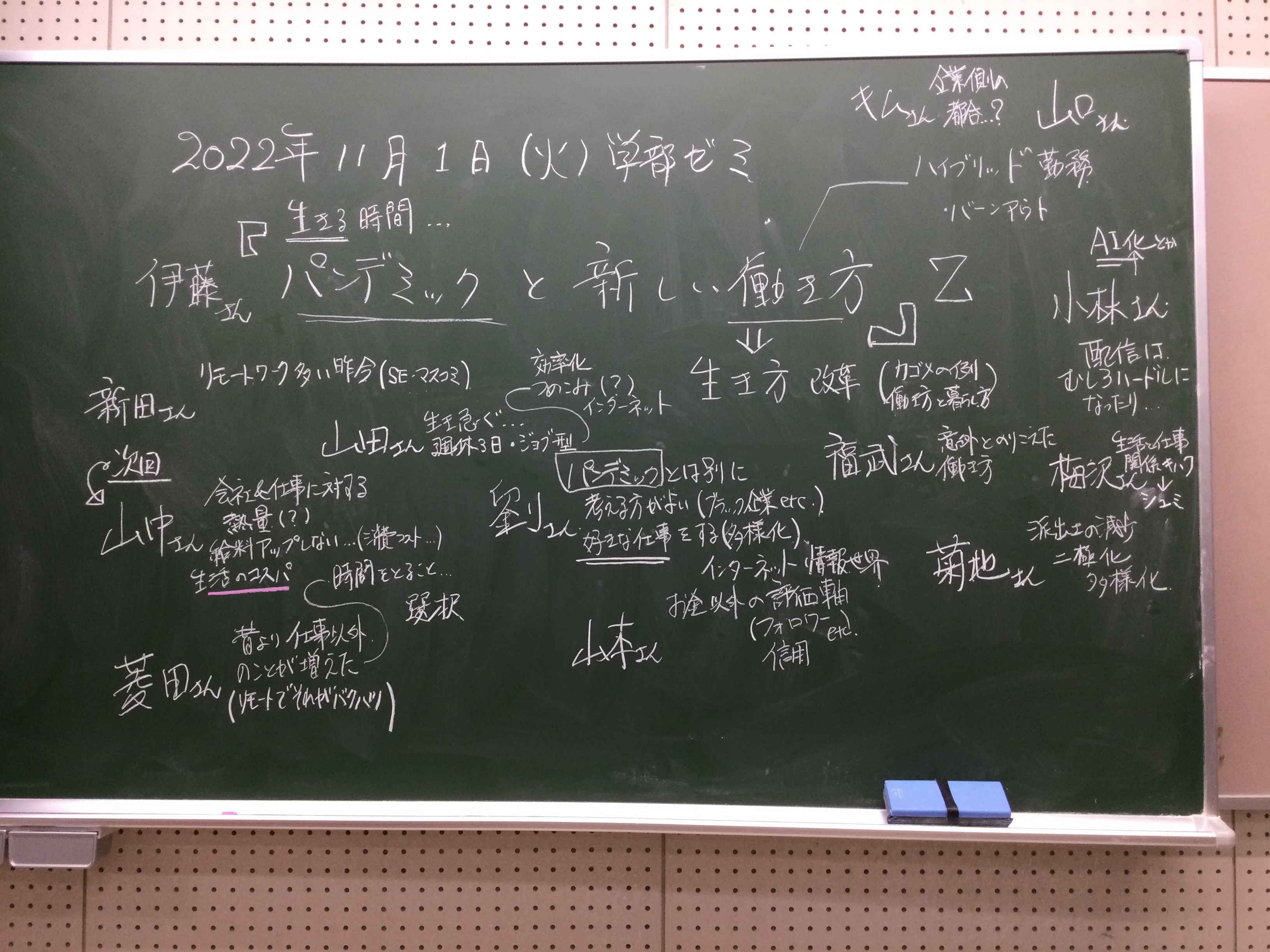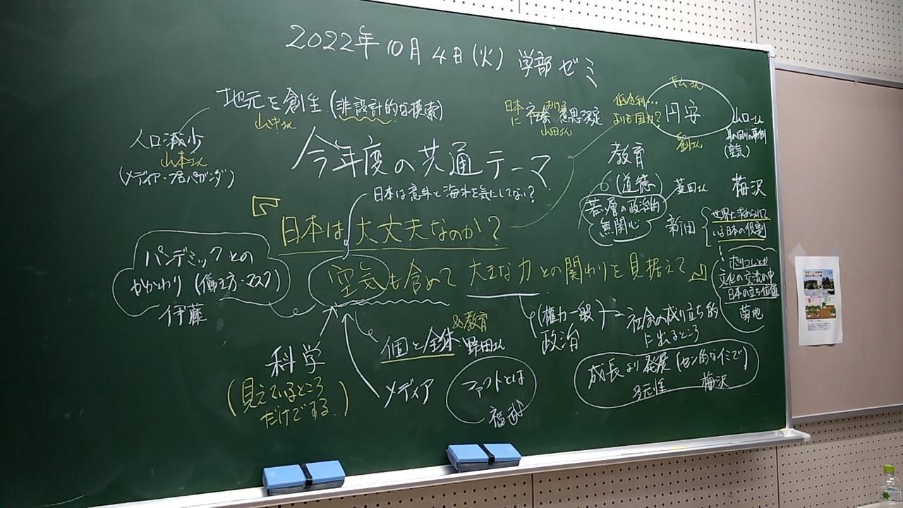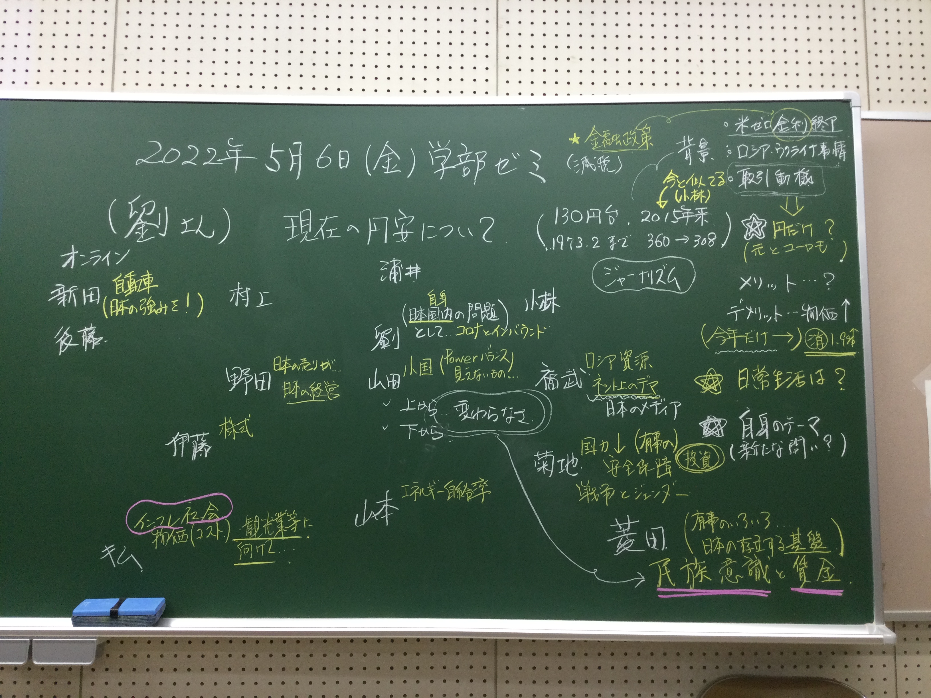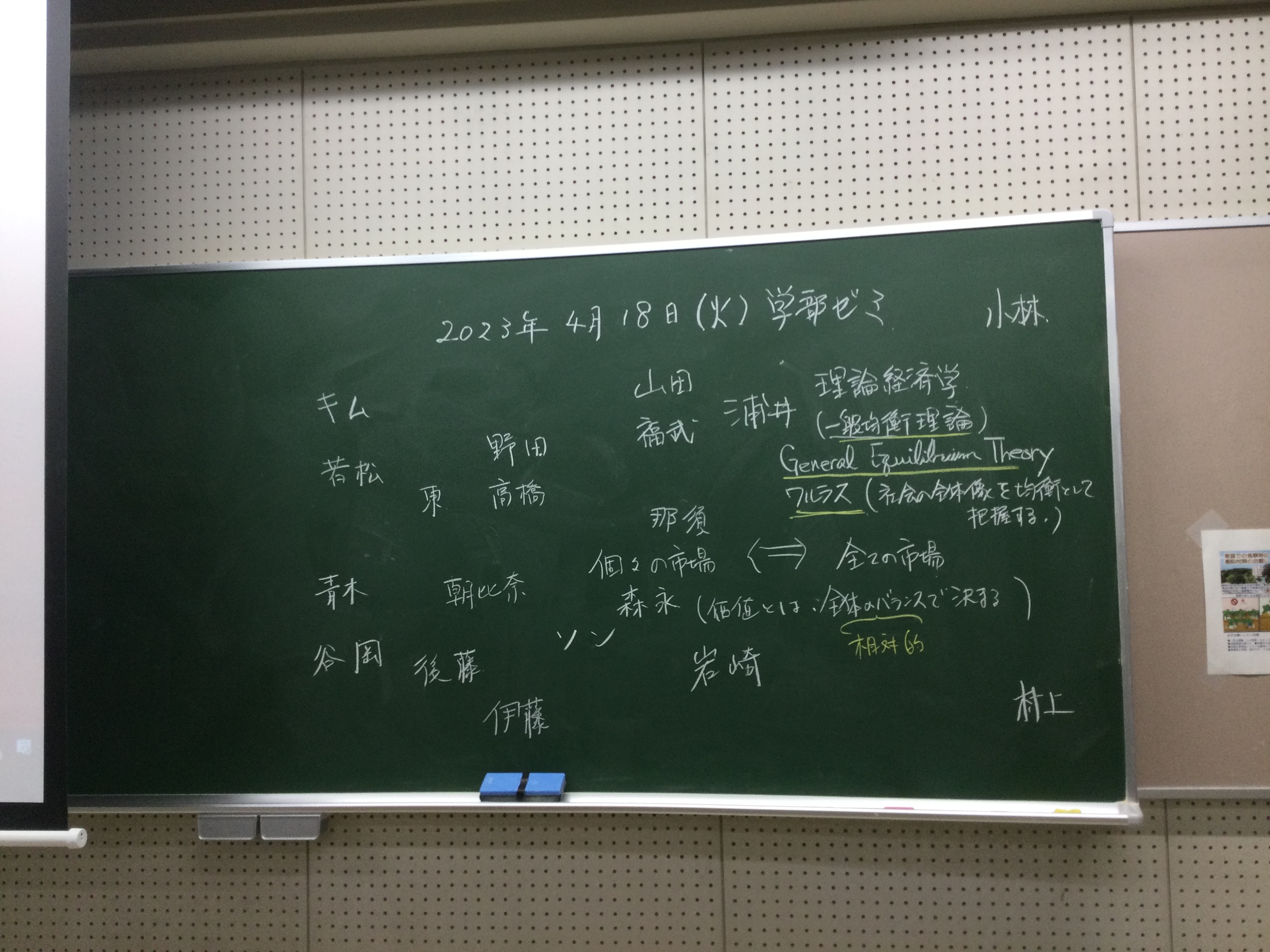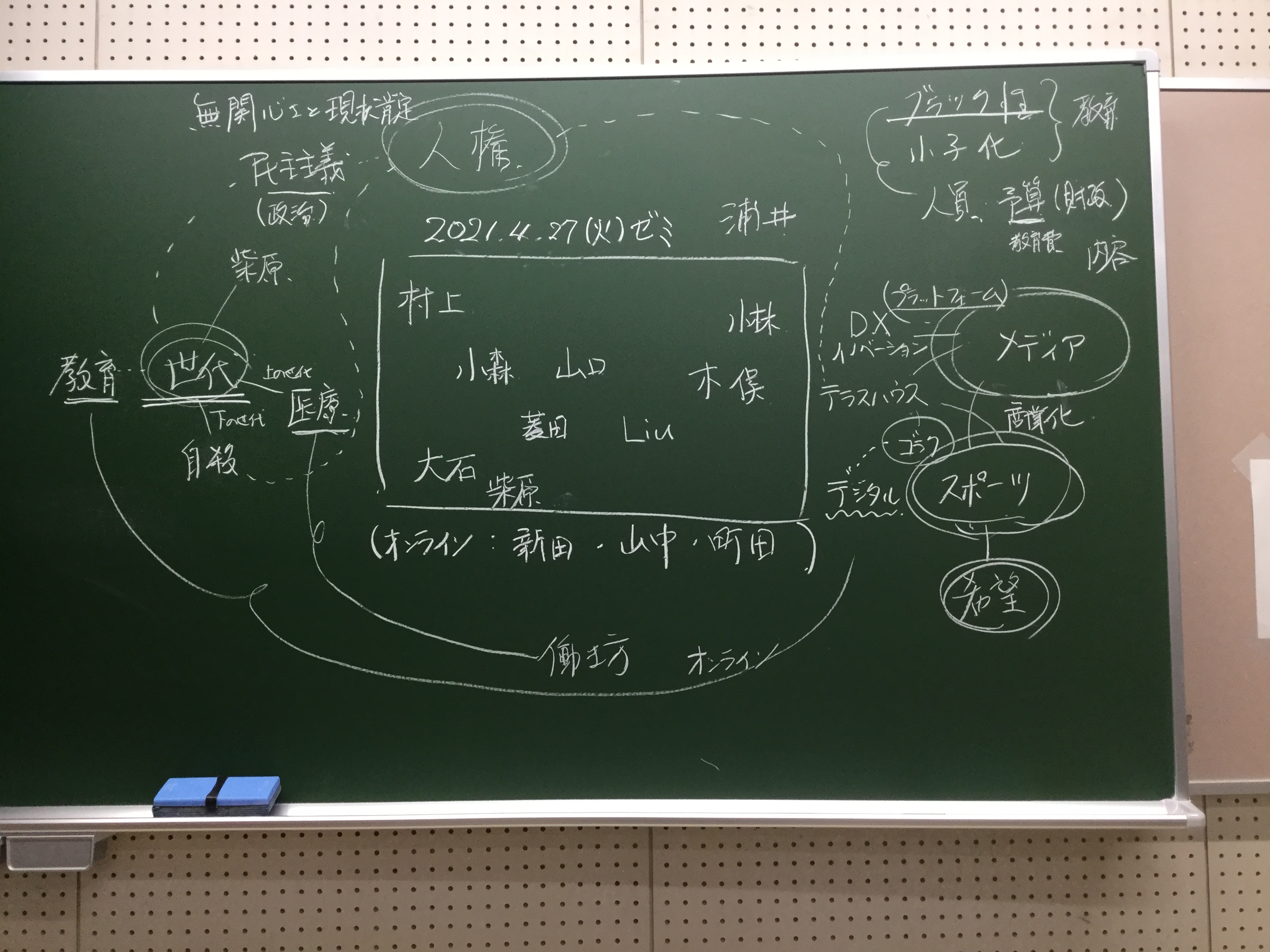 本日の板書をアップします。今日は折角対面の機会だったのに、議論の方向に上手に話を持っていくことができなくて、すみませんでした。次回5月11日(火)はオンラインになってしまいますが、柴原