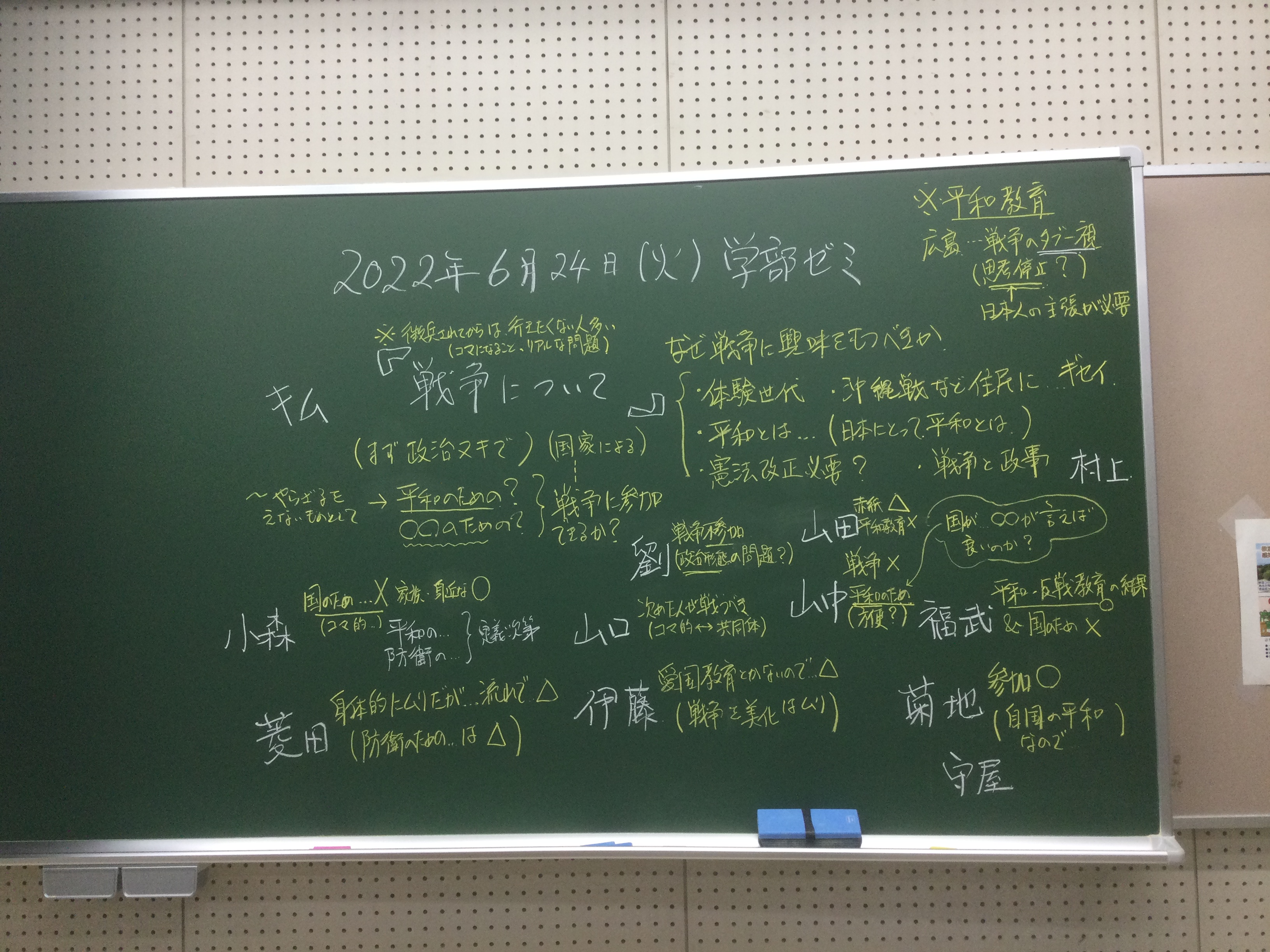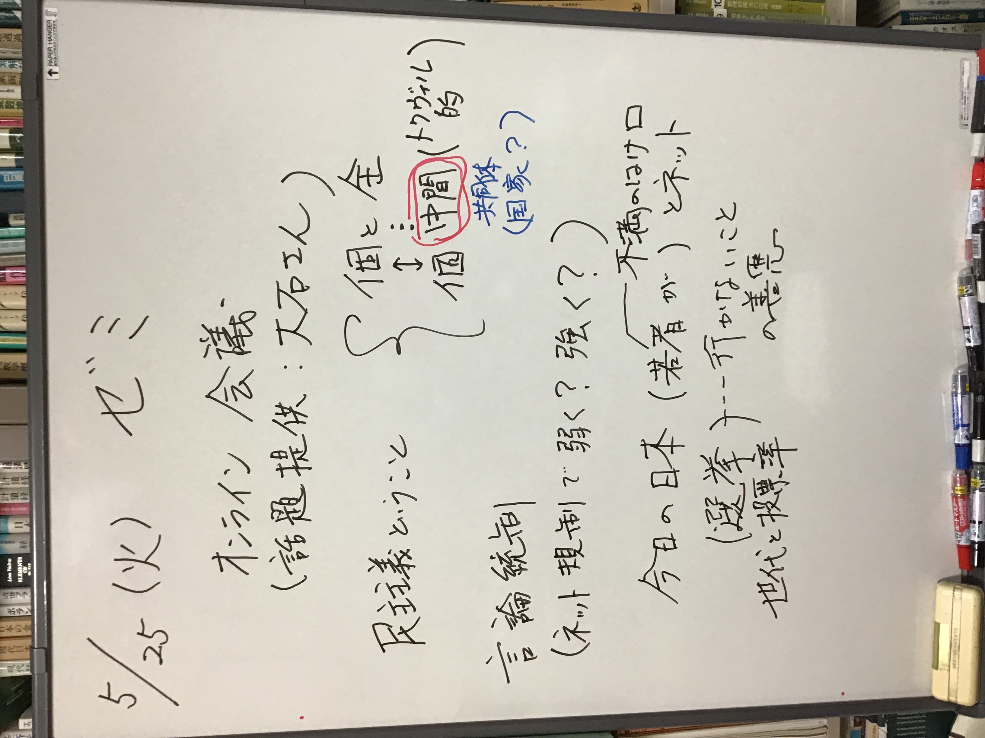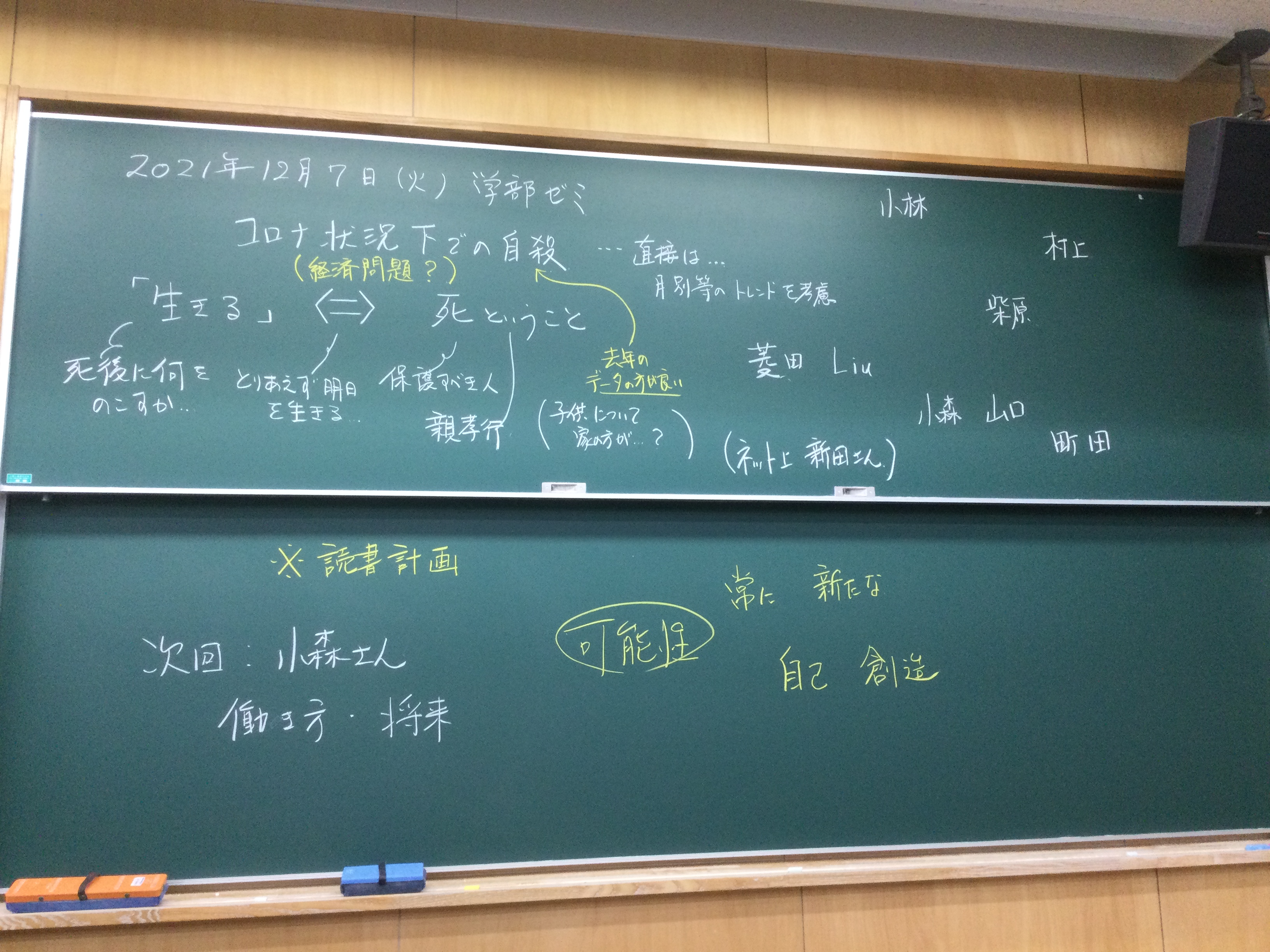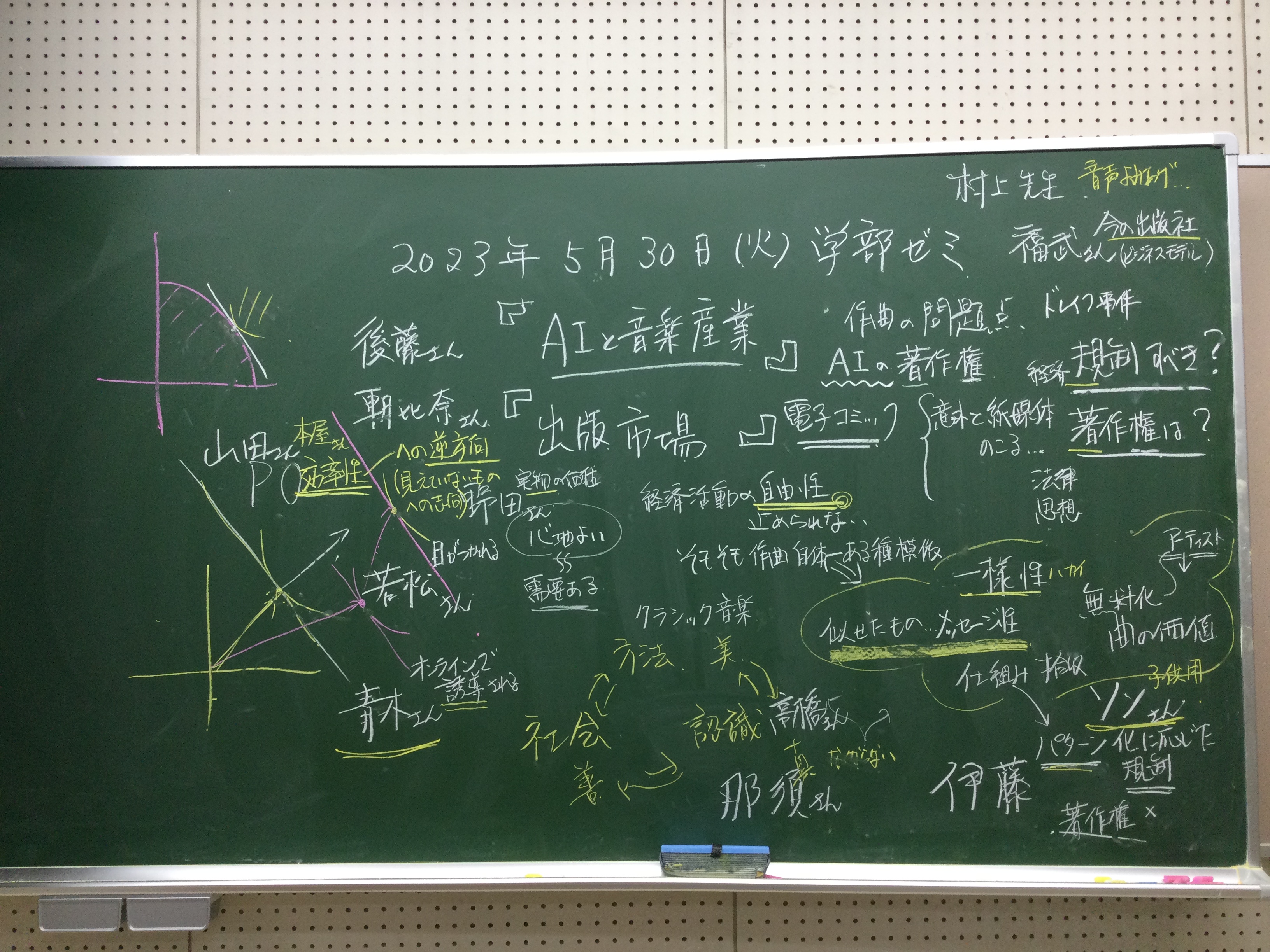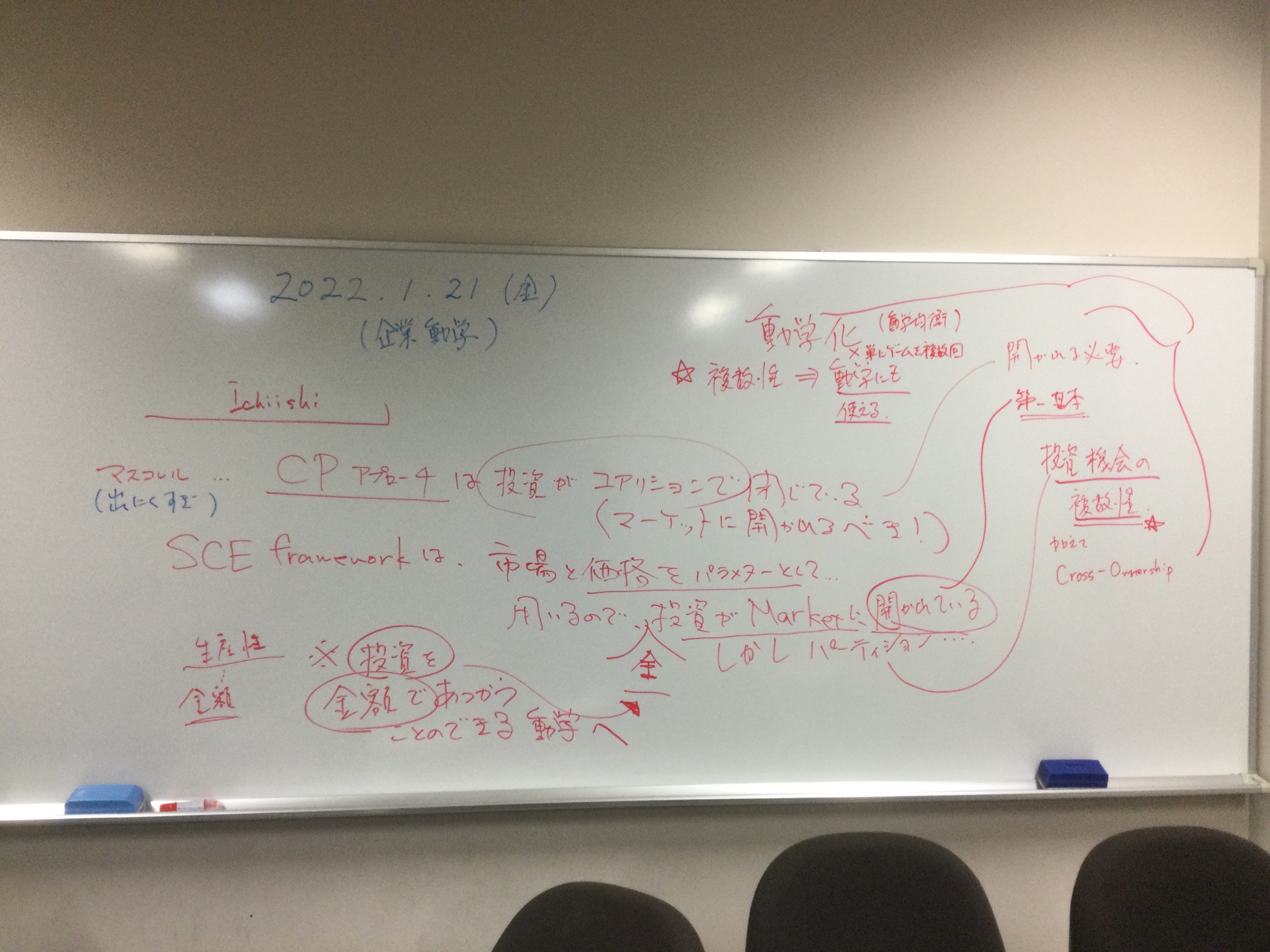 本日の板書をアップします。今日は折角対面の機会だったのに、議論の方向に上手に話を持っていくことができなくて、すみませんでした。次回5月11日(火)はオンラインになってしまいますが、柴原