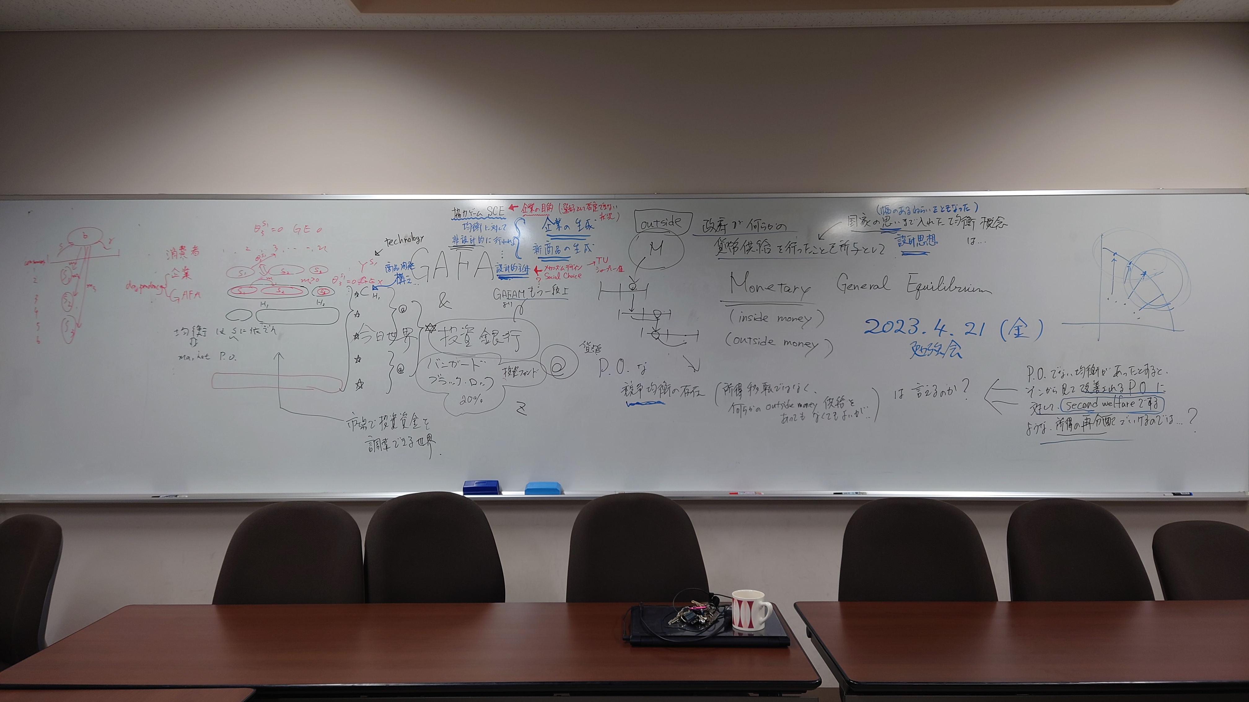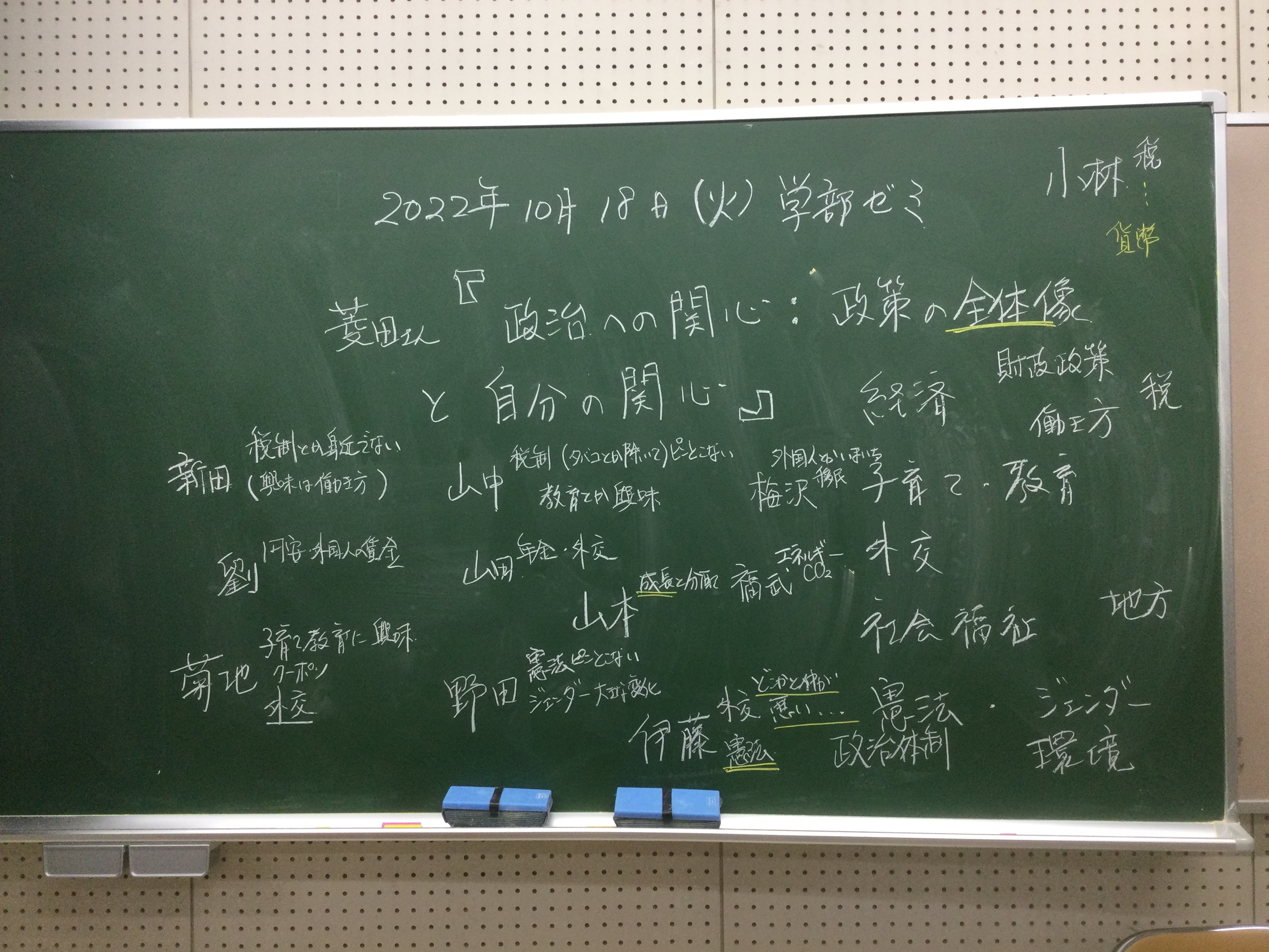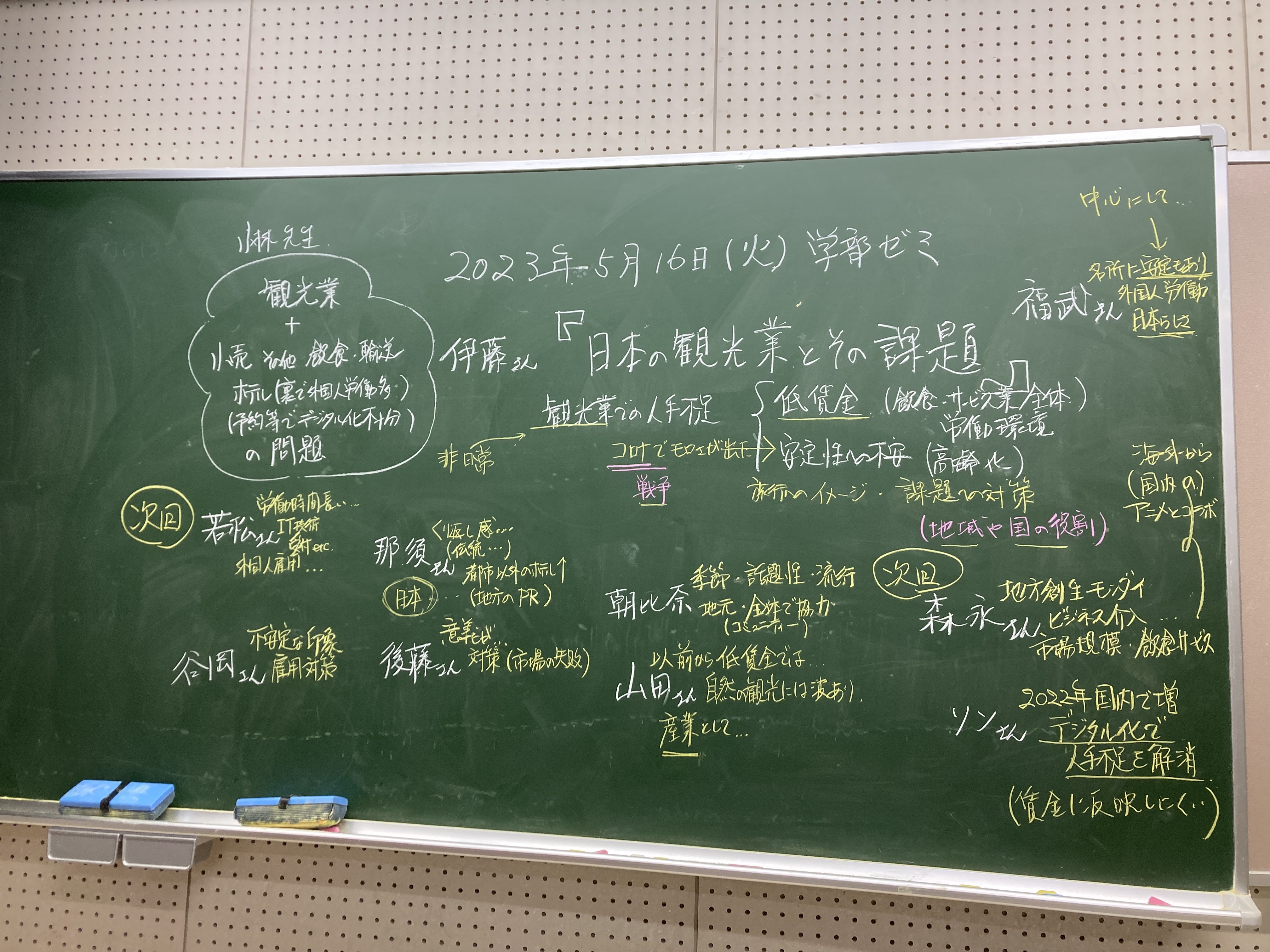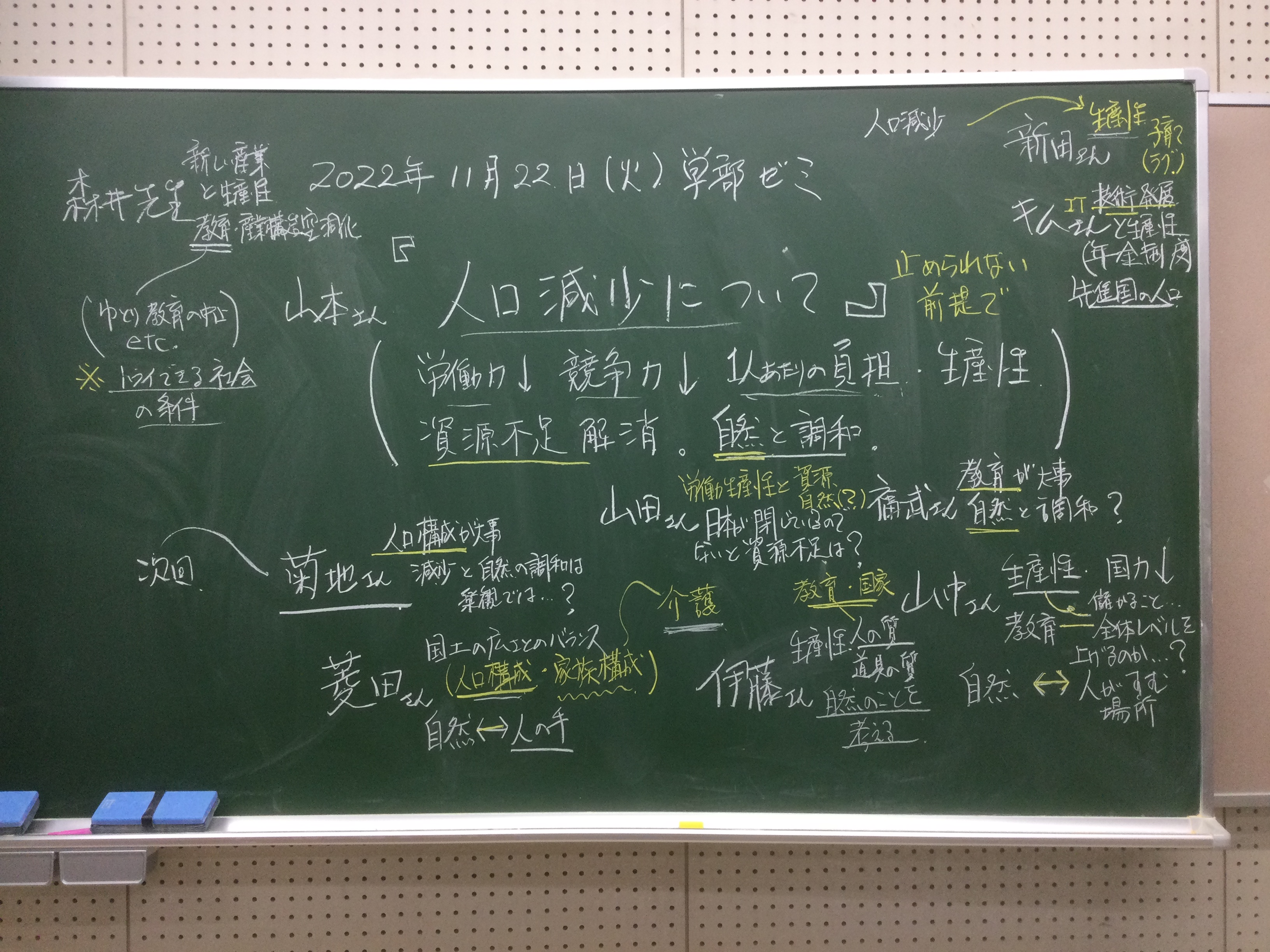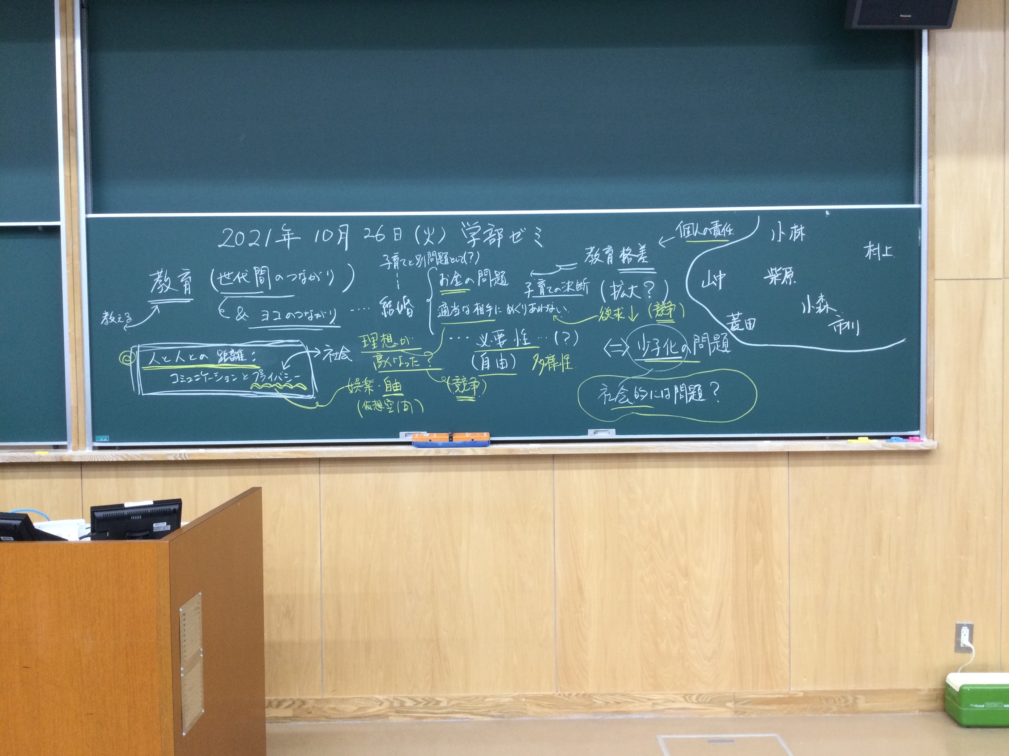 本日の板書をアップします。今日は折角対面の機会だったのに、議論の方向に上手に話を持っていくことができなくて、すみませんでした。次回5月11日(火)はオンラインになってしまいますが、柴原