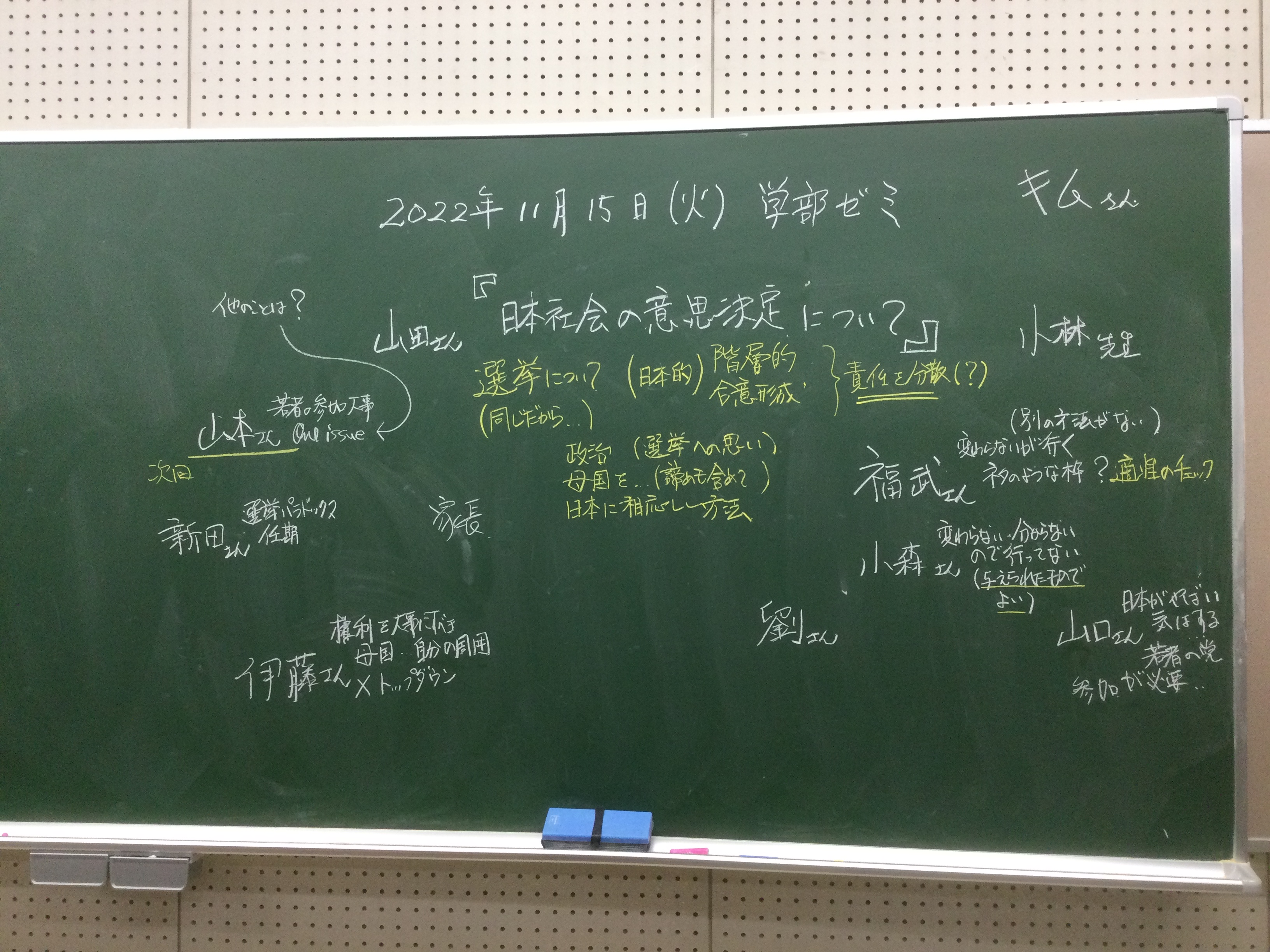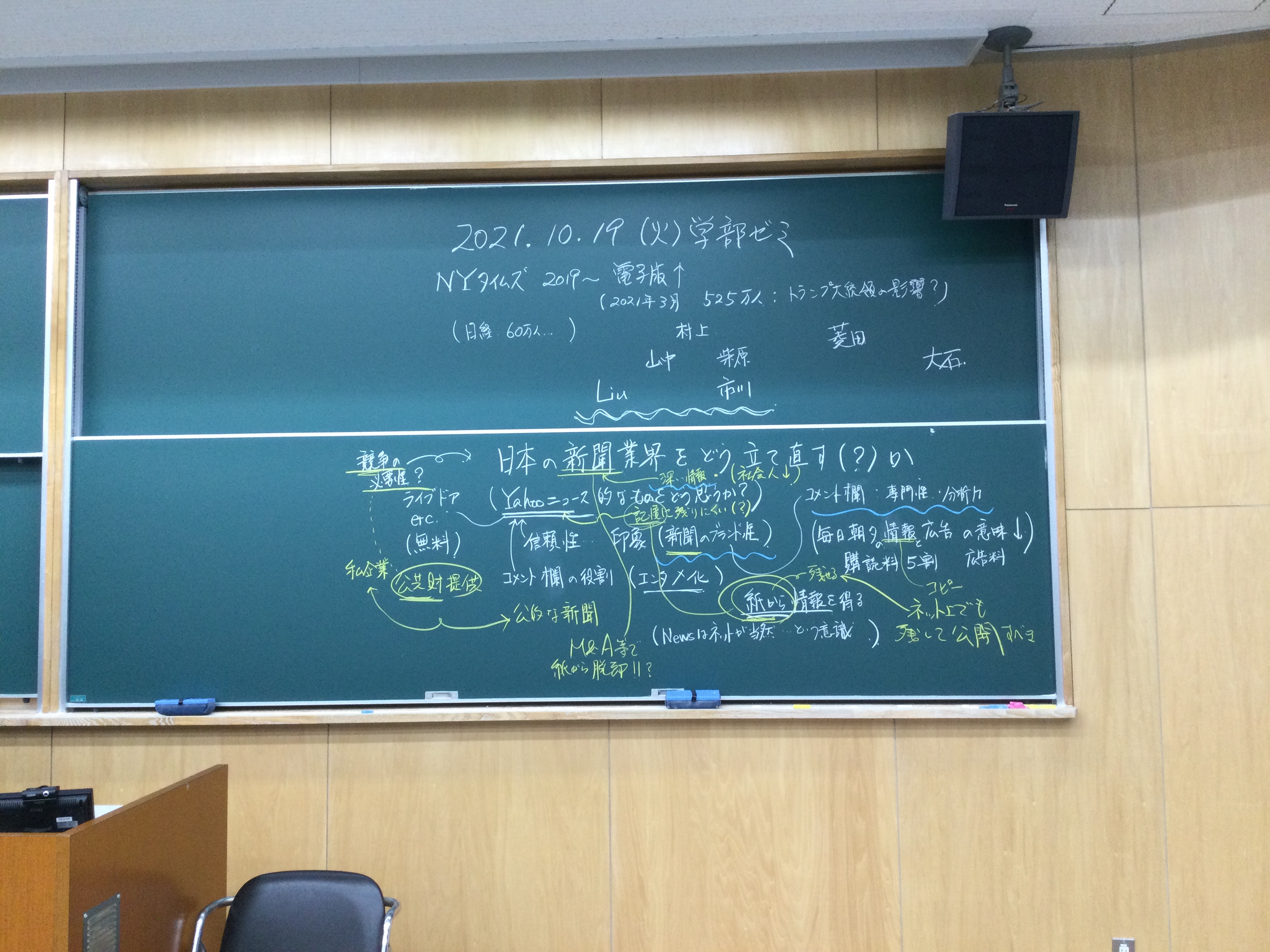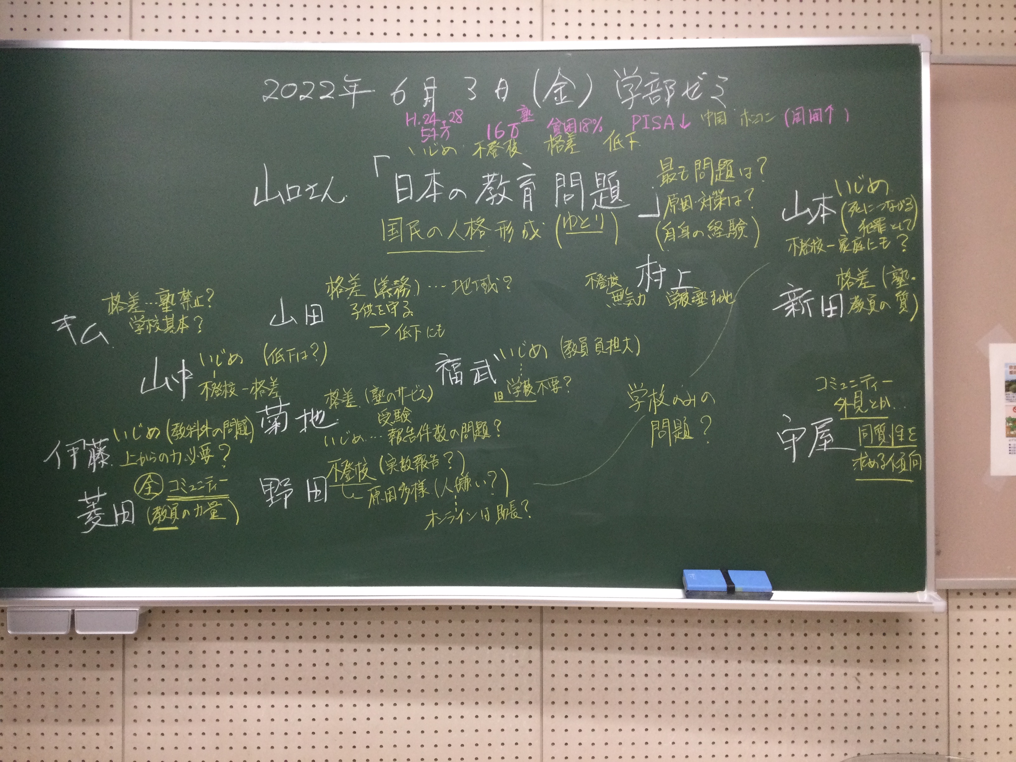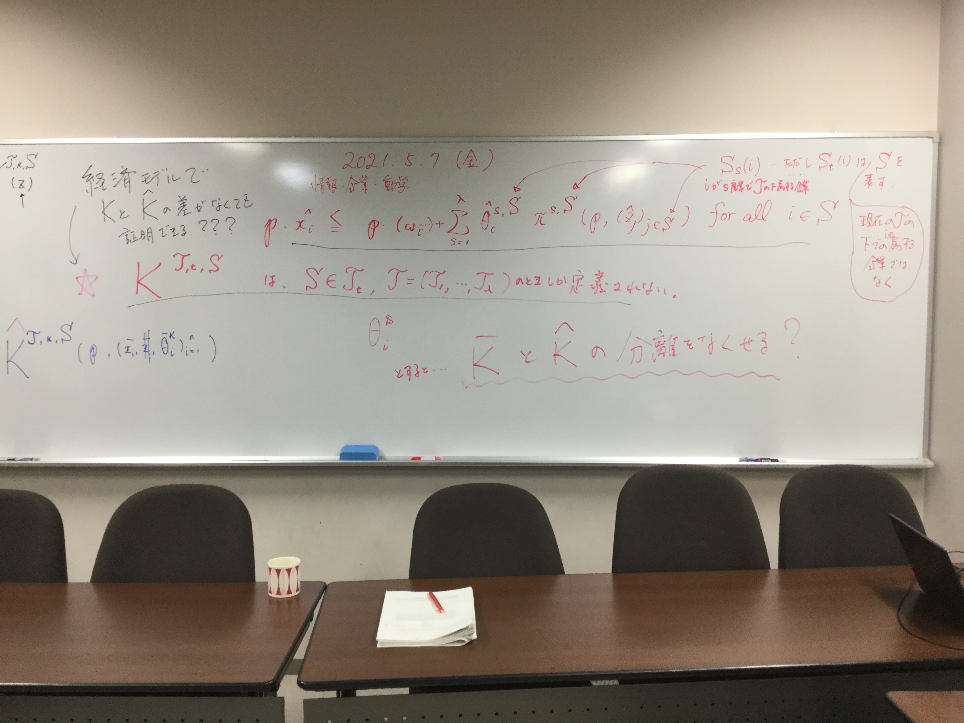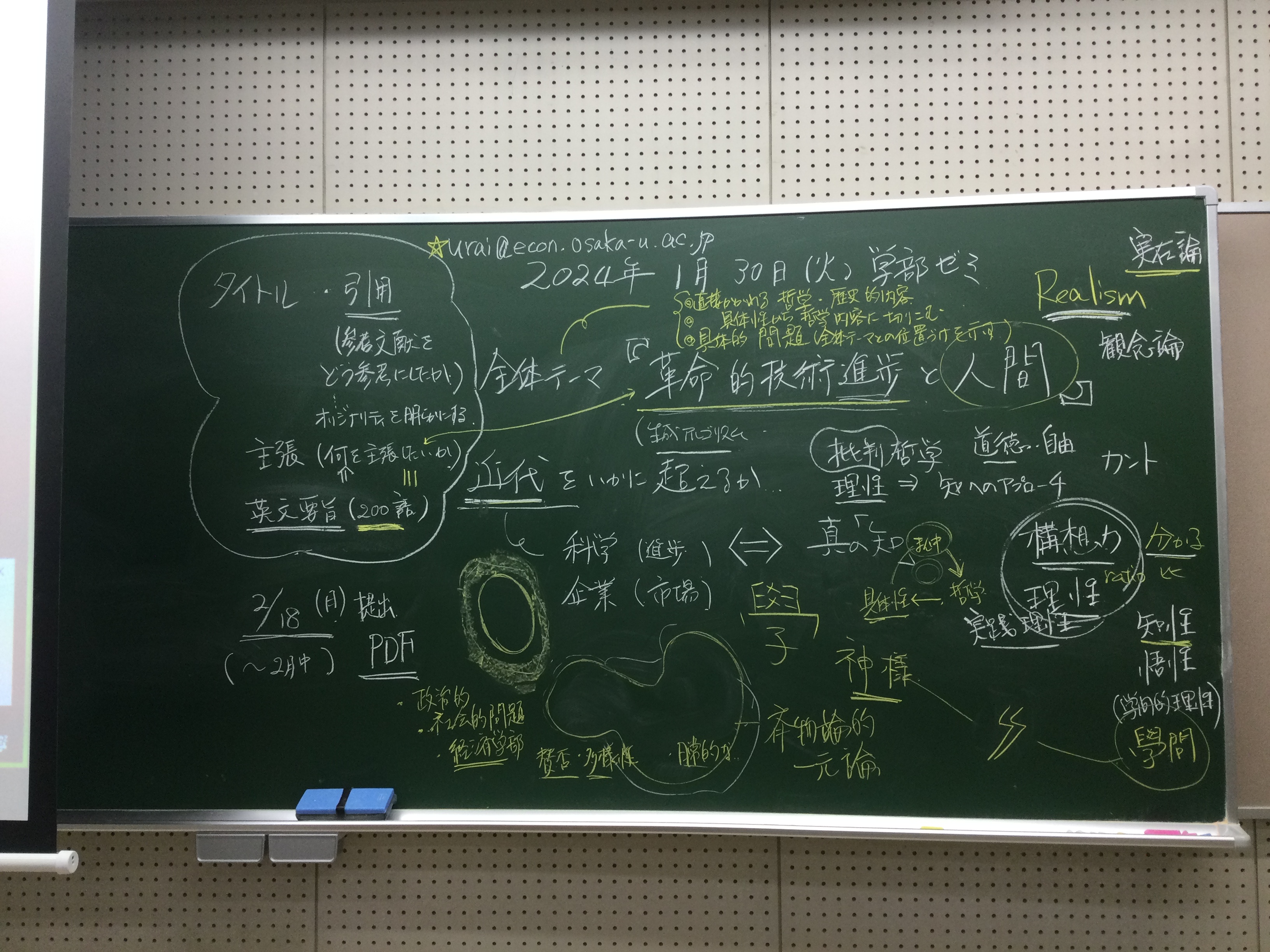 本日の板書をアップします。今日は折角対面の機会だったのに、議論の方向に上手に話を持っていくことができなくて、すみませんでした。次回5月11日(火)はオンラインになってしまいますが、柴原