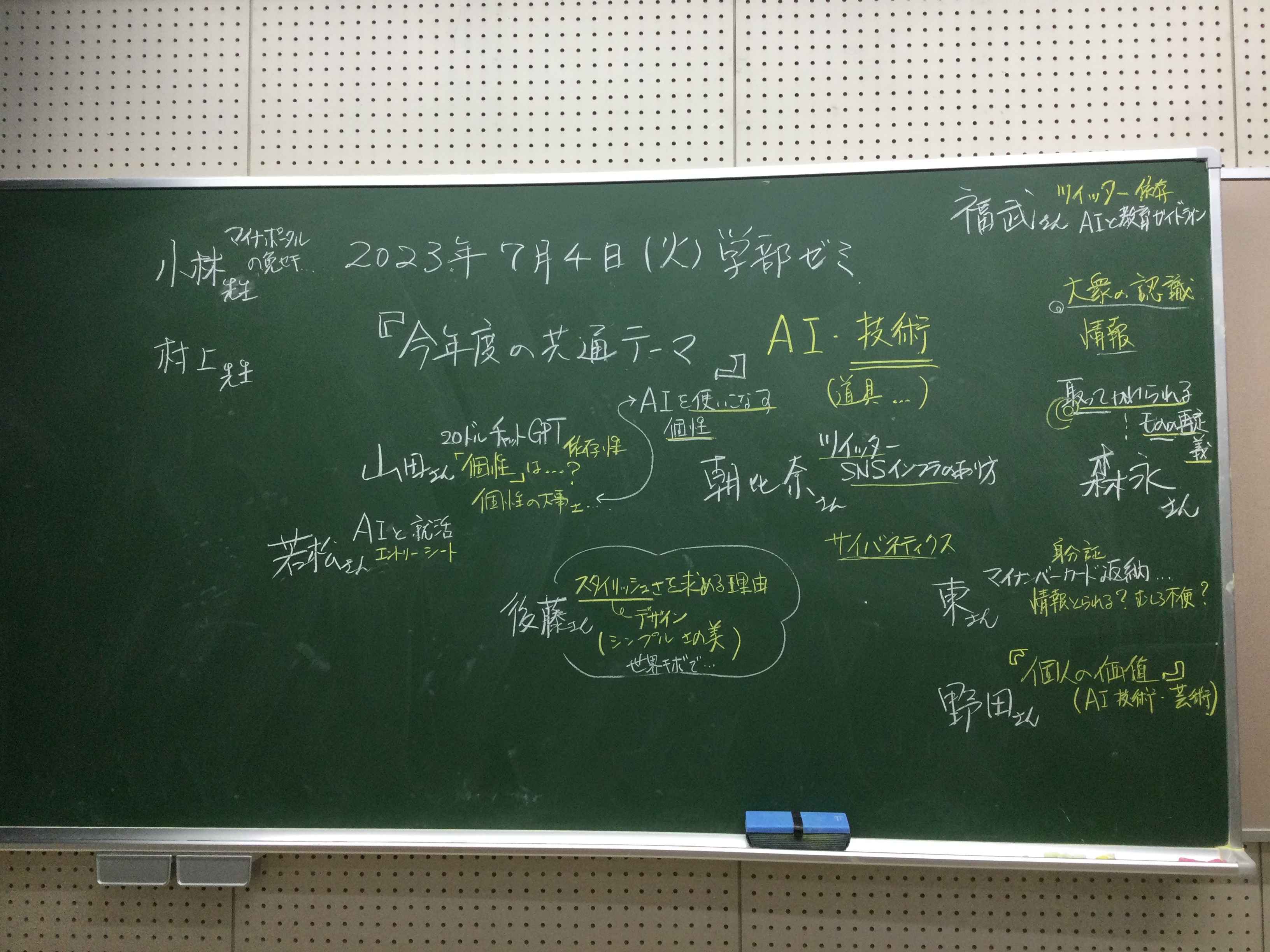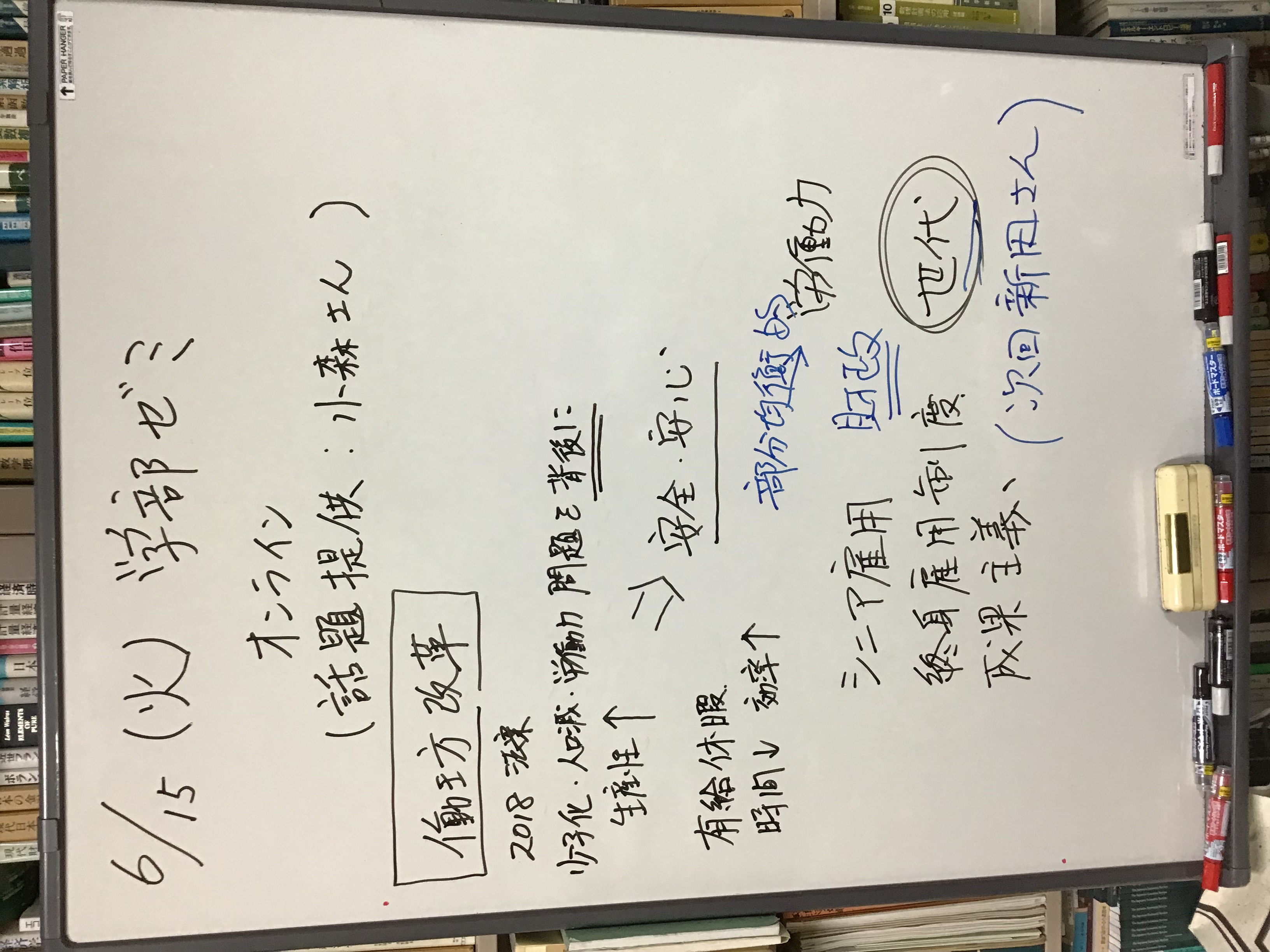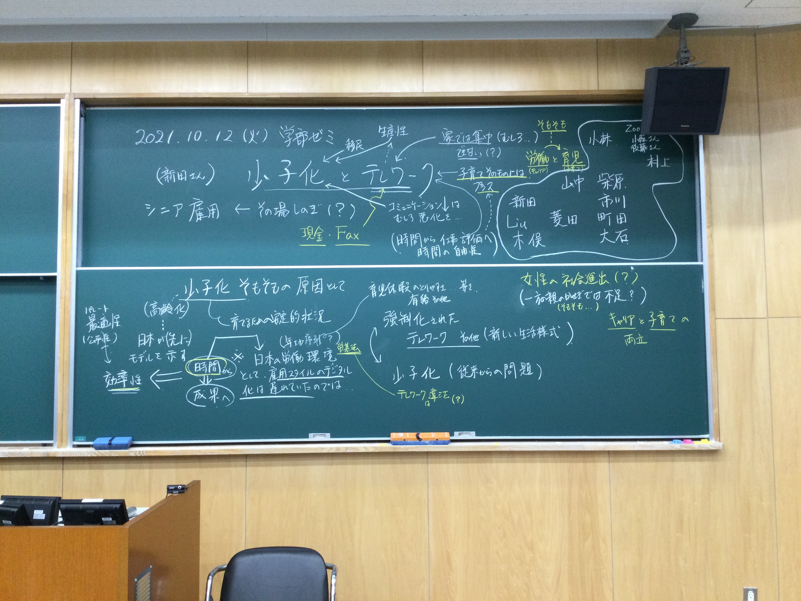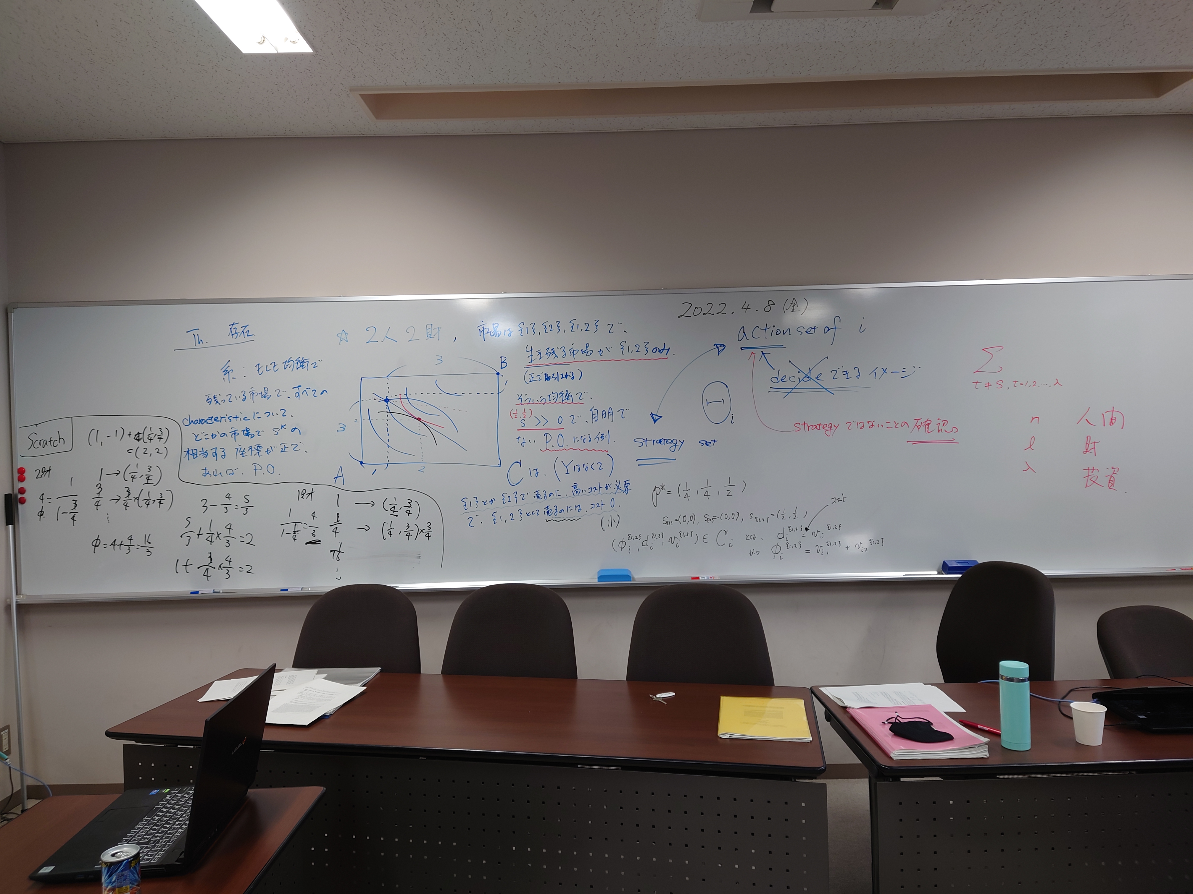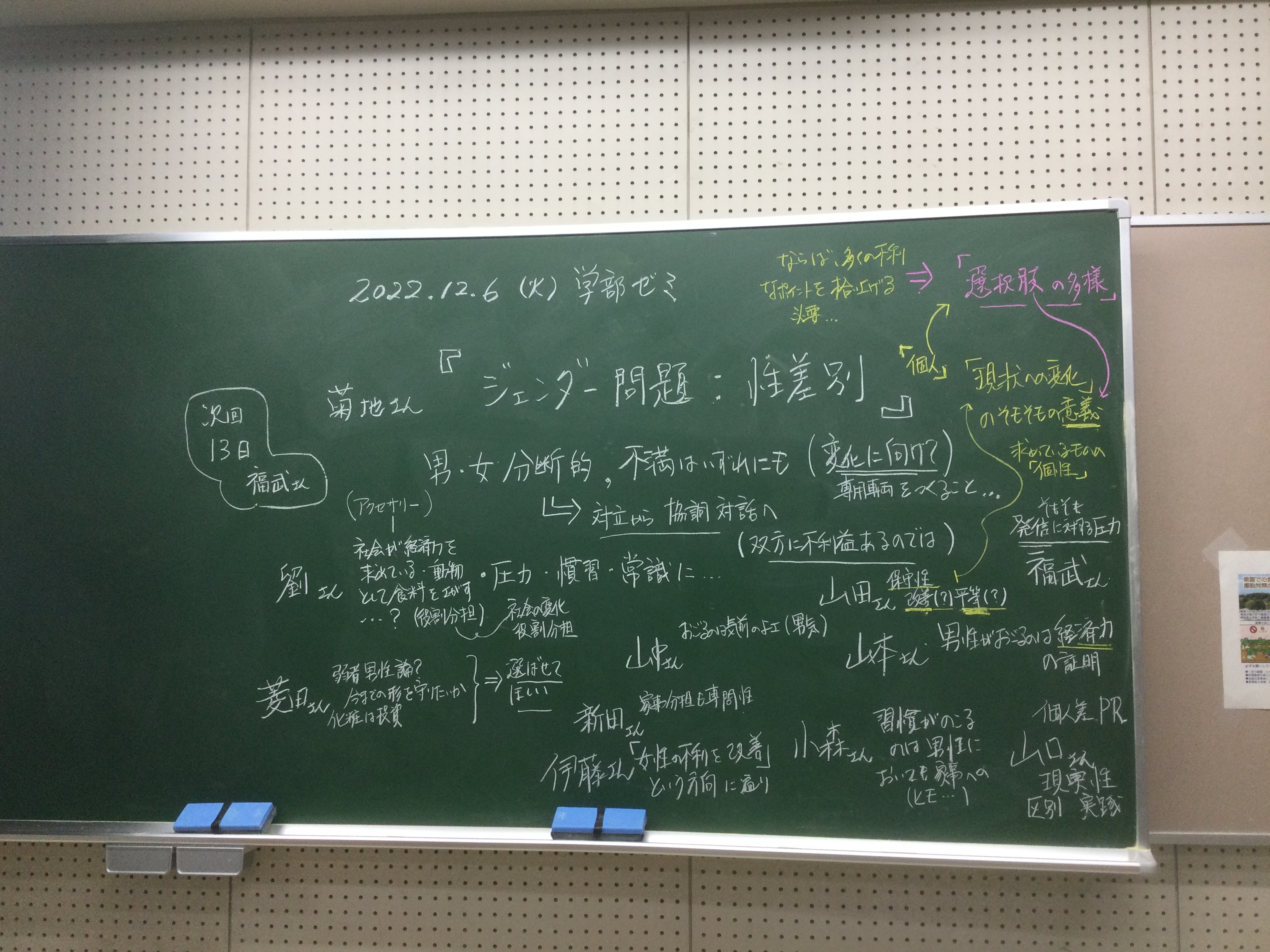 本日の板書をアップします。今日は折角対面の機会だったのに、議論の方向に上手に話を持っていくことができなくて、すみませんでした。次回5月11日(火)はオンラインになってしまいますが、柴原