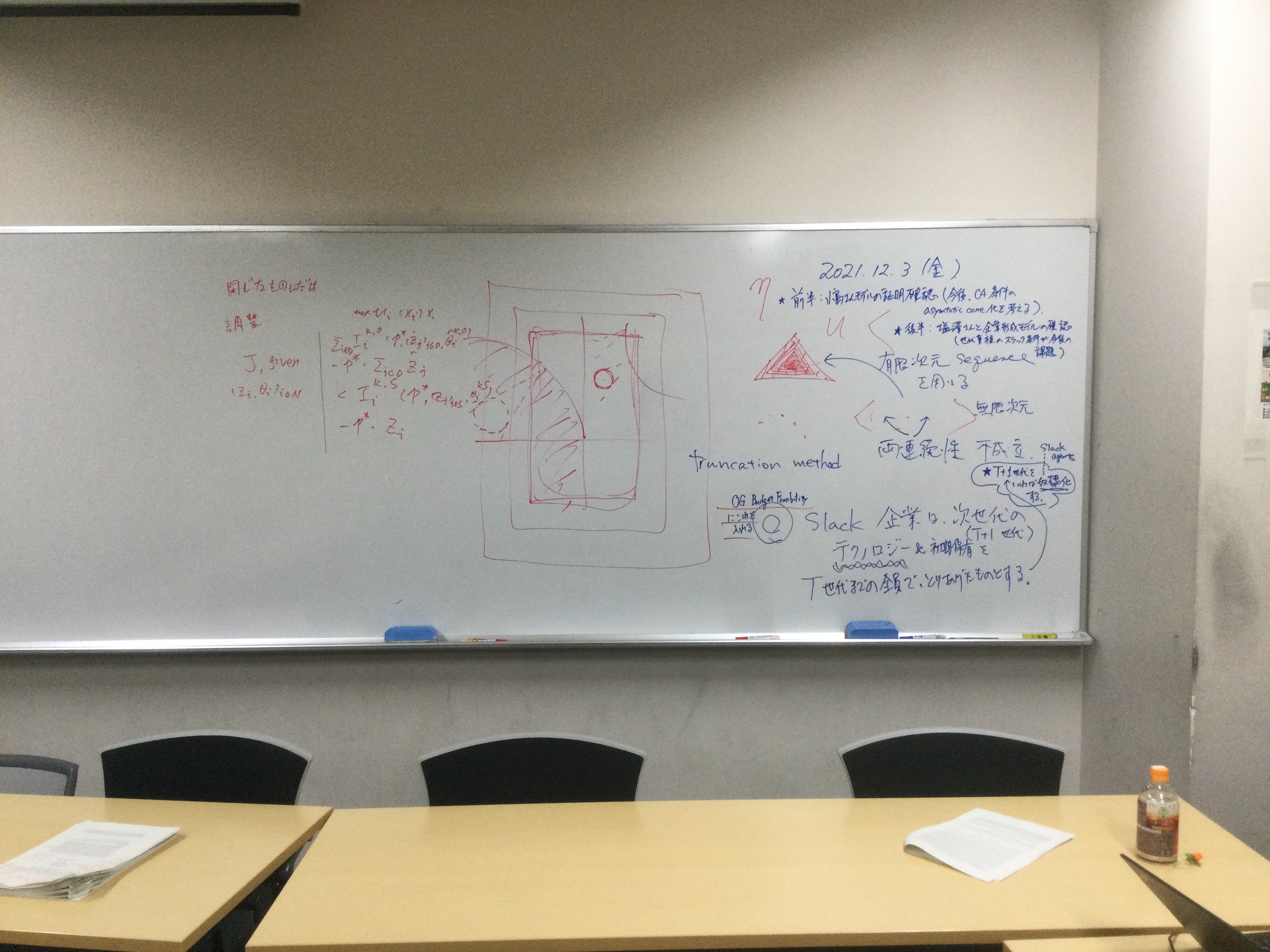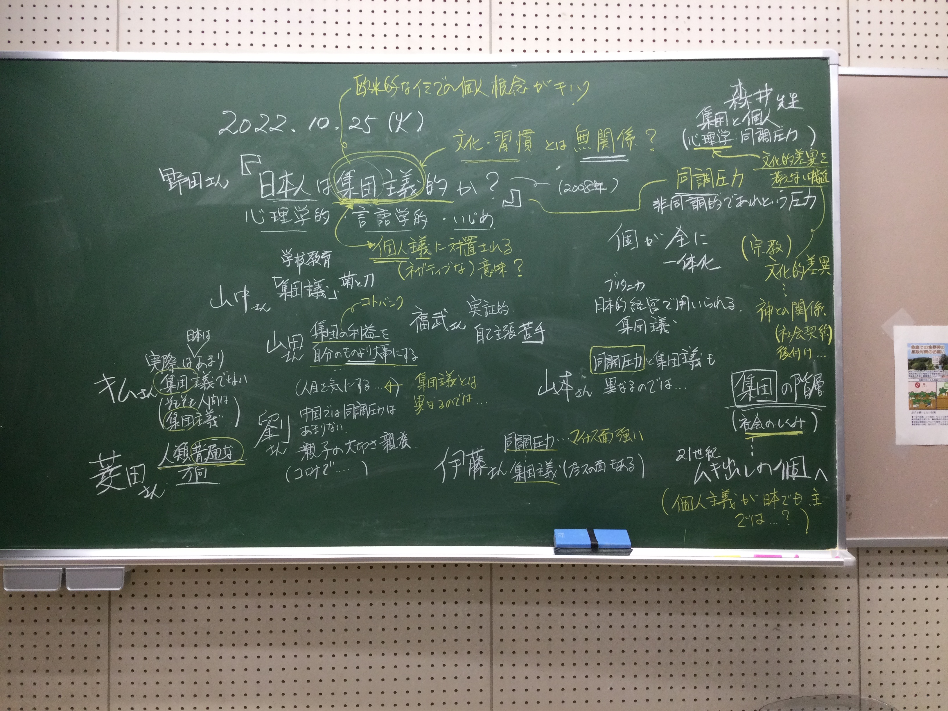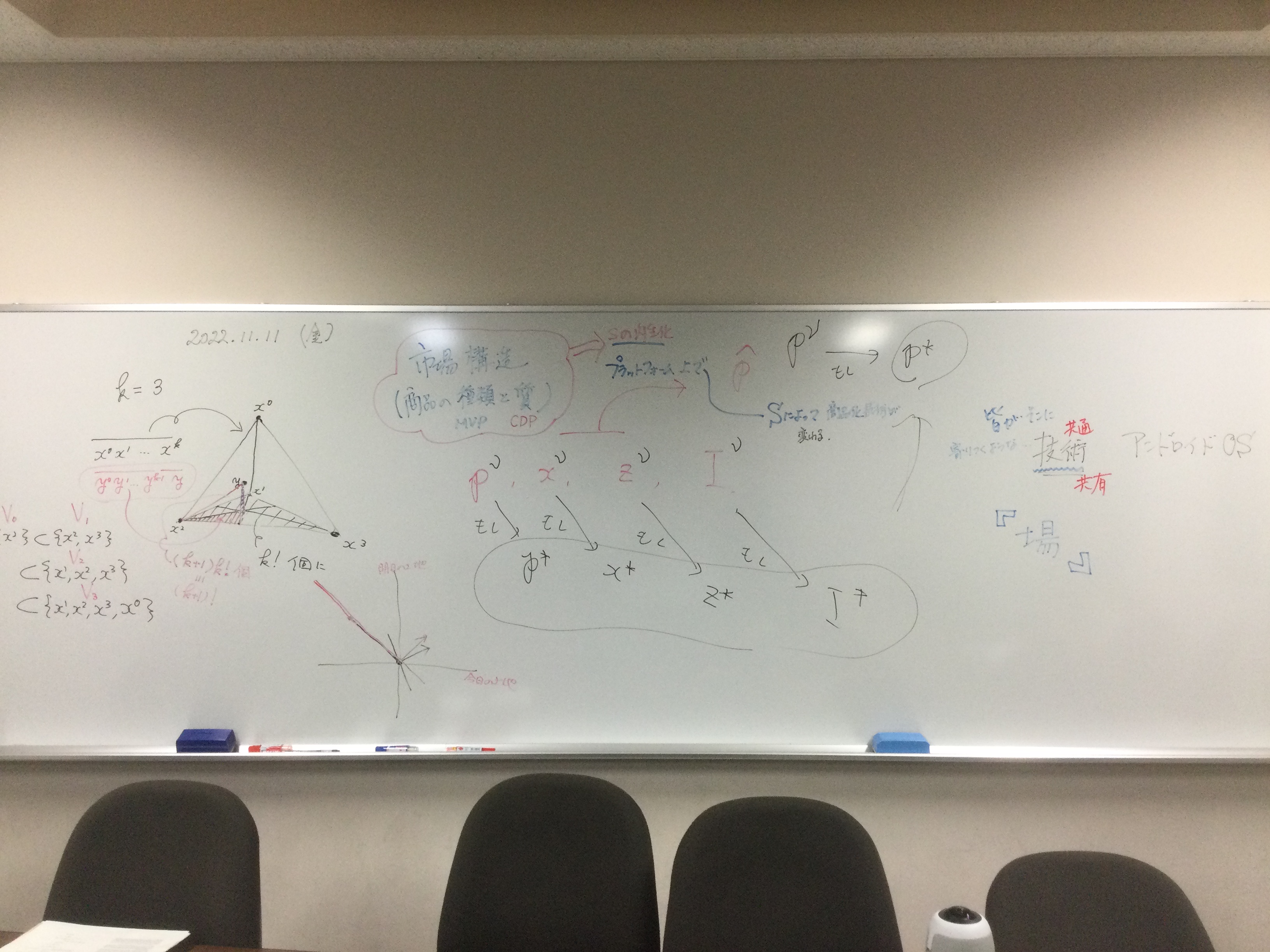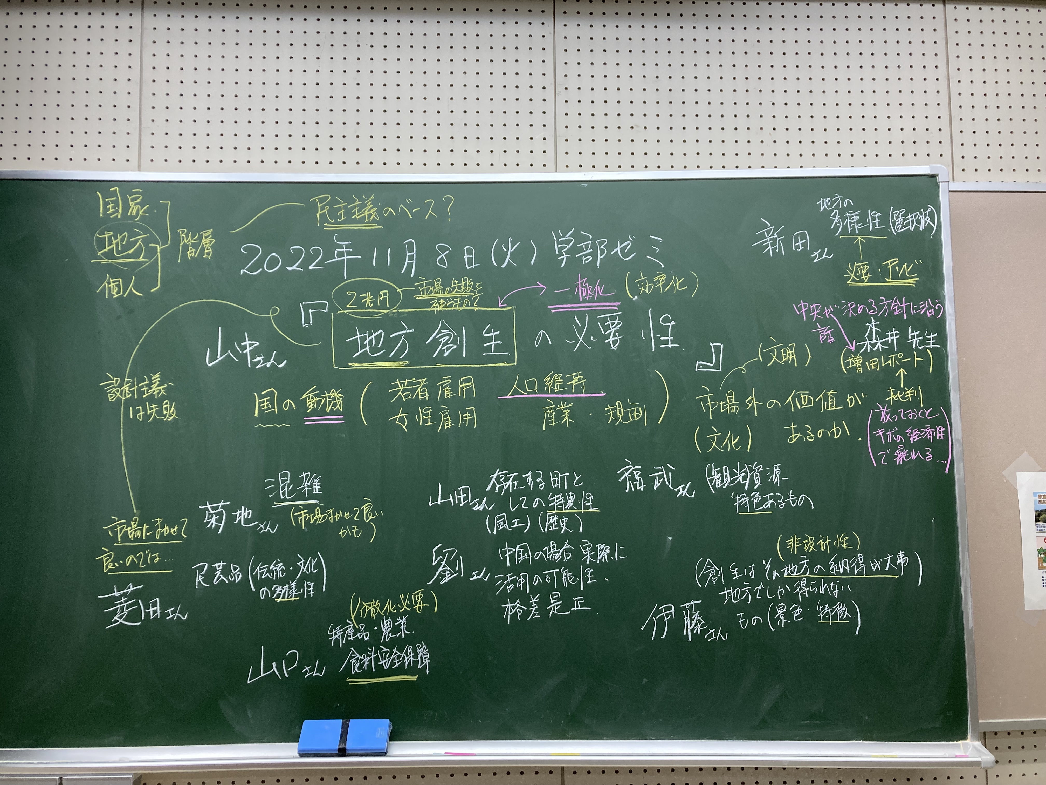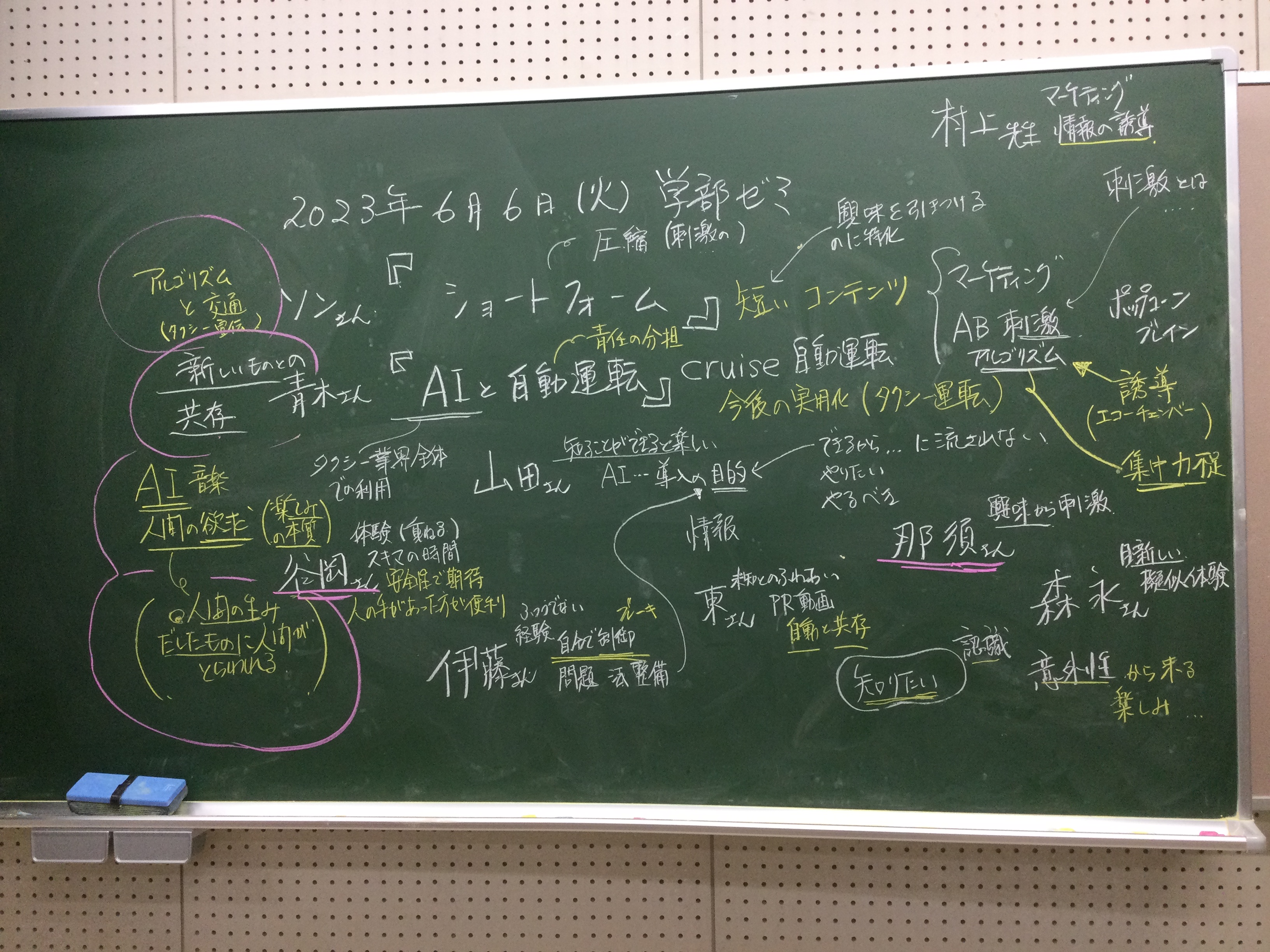 本日の板書をアップします。今日は折角対面の機会だったのに、議論の方向に上手に話を持っていくことができなくて、すみませんでした。次回5月11日(火)はオンラインになってしまいますが、柴原