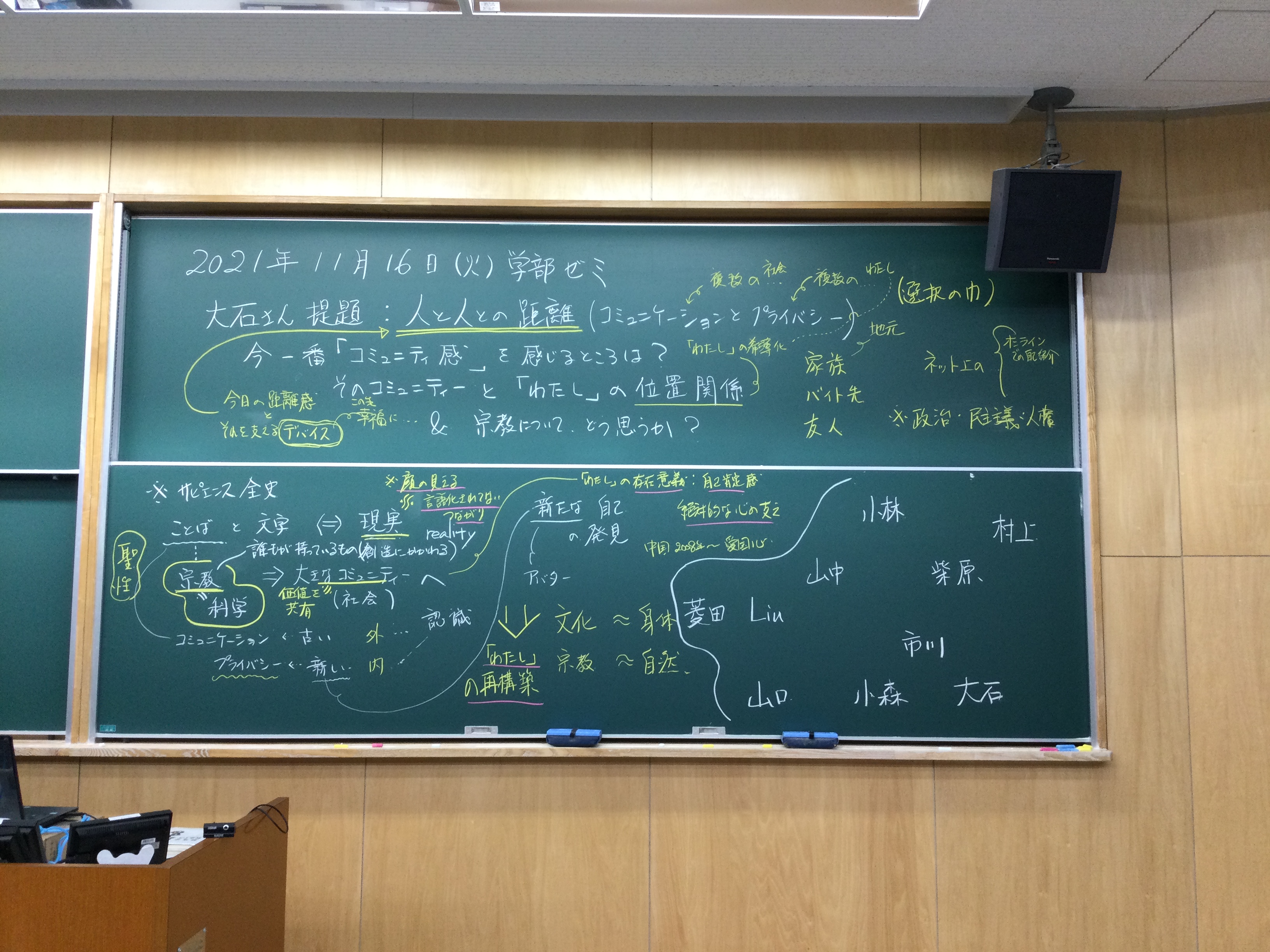 本日は、大石さんの提題で、今年度の共通テーマである『人と人との距離:コミュニケーションとプライバシー』という問題に立ち戻っての議論が展開されました。「宗教とは」ということまで含めた広い話になりましたが、特に「わたし」ということの